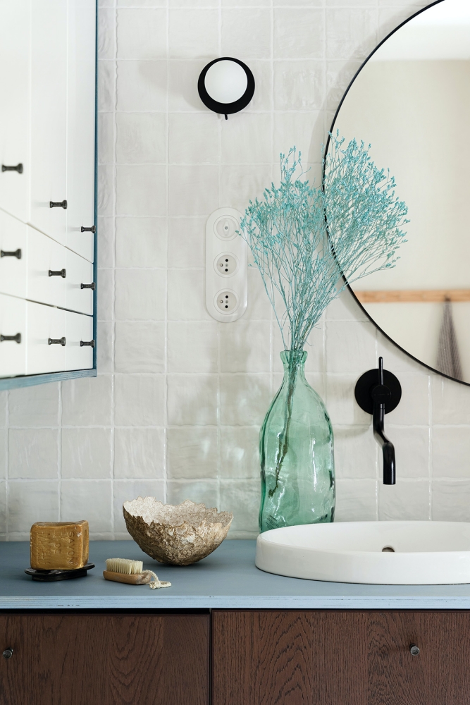 biała łazienka z drewnem i niebieskimi akcentami