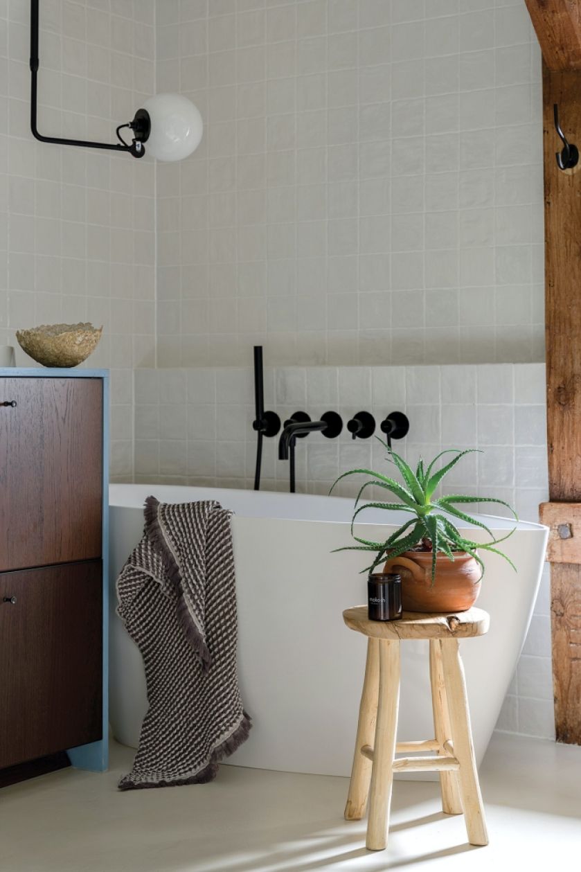biała łazienka z drewnem i czarnymi akcentami