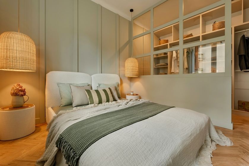 Oliwkowa zieleń, tapeta jak arras i sprytne, wielofunkcyjne meble – inspirująca aranżacja mieszkania 53 m2 w sercu Warszawy