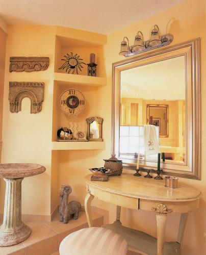Łazienkę zdobią kamienne dekoracje. Miejsce dla drobiazgów
