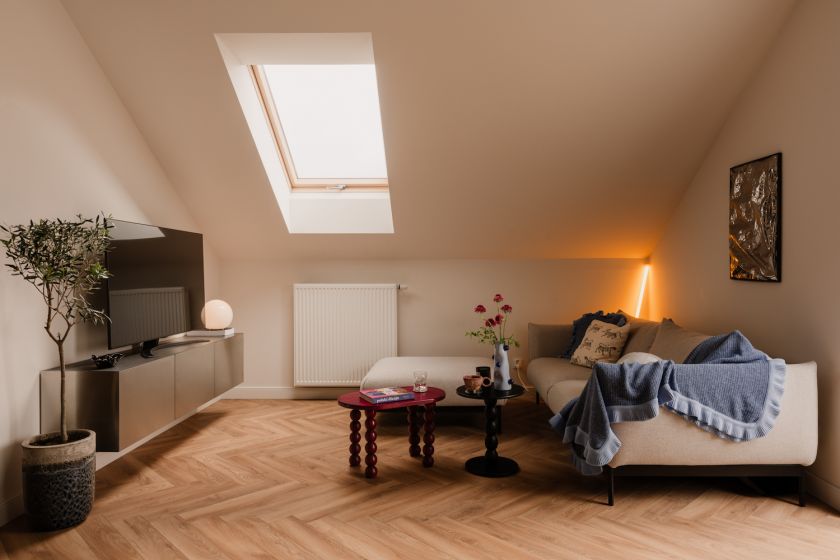 Mieszkanie pod skosami w pastelowych kolorach – jak ciekawie połączyć nowoczesność i retro z akcentami designu na 46 metrach