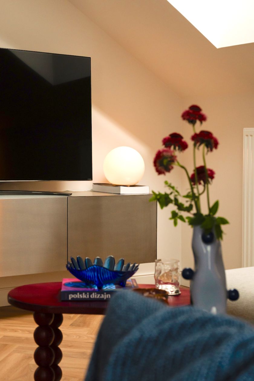 Mieszkanie pod skosami w pastelowych kolorach – jak ciekawie połączyć nowoczesność i retro z akcentami designu na 46 metrach