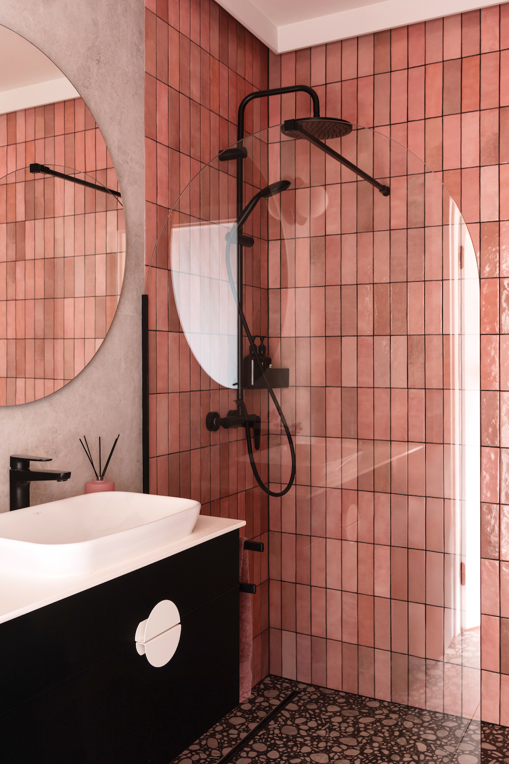 łazienka z różowymi płytkami i czarnymi dodatkami
