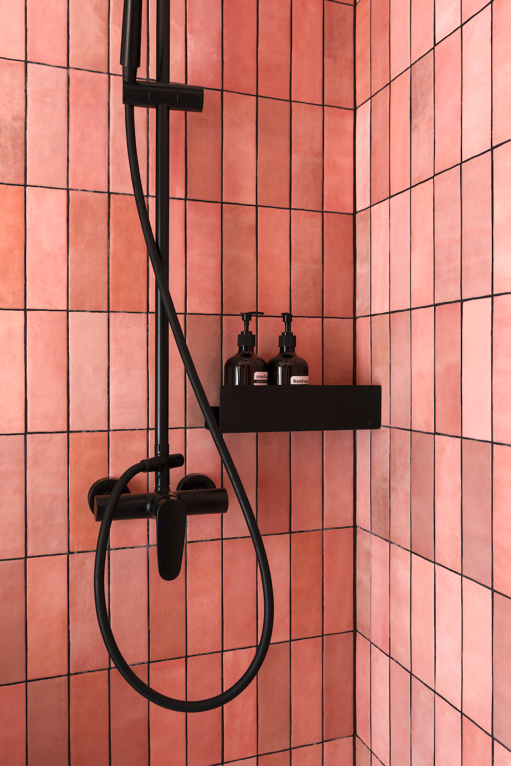 łazienka z różowymi płytkami i czarnymi dodatkami