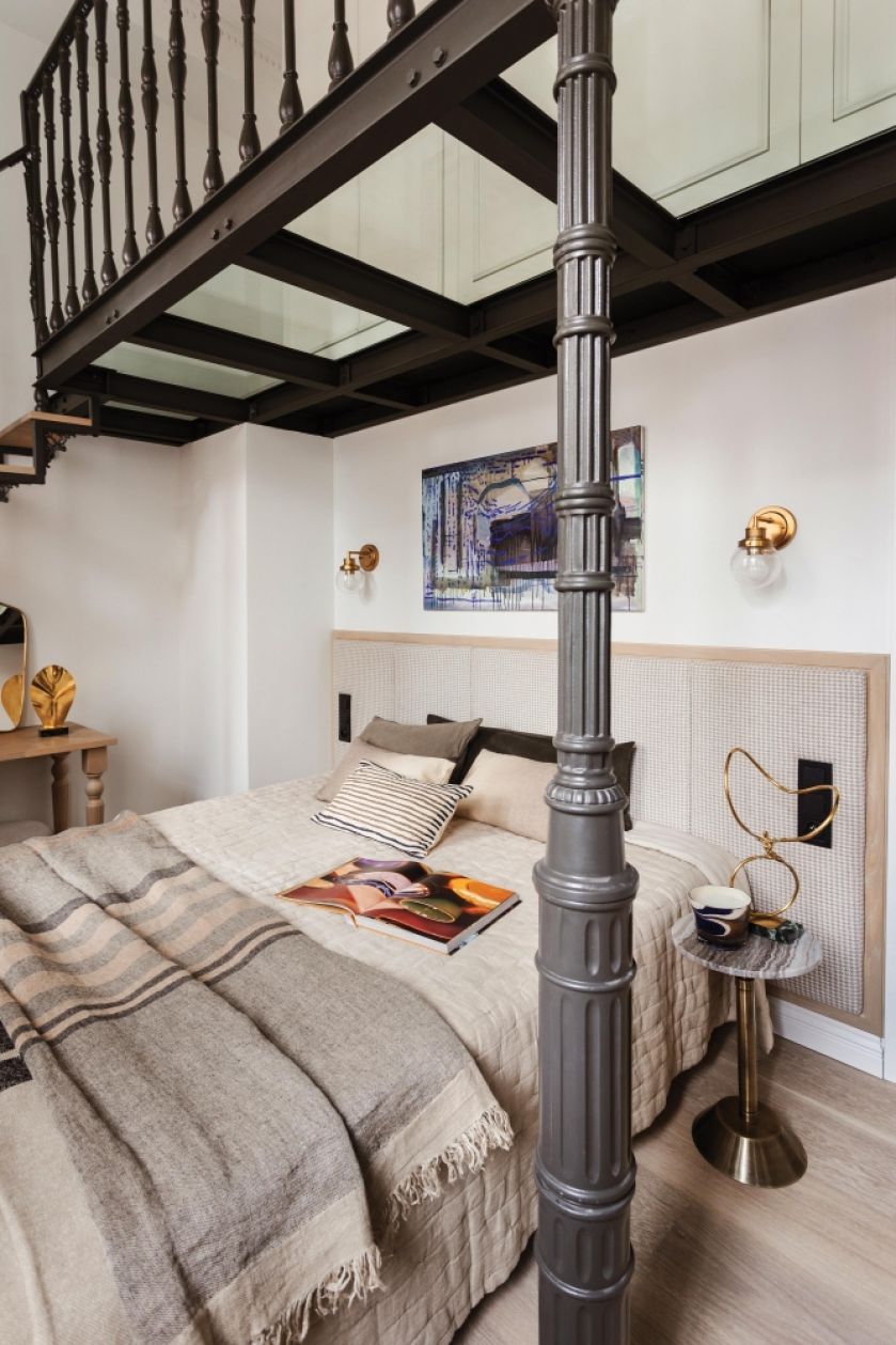 żeliwne kolumny i szklana antresola w mieszkaniu