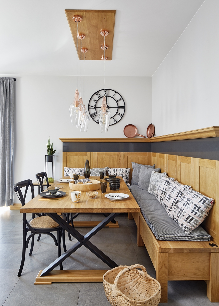 Warto zabezpieczyć ścianę przy stole przed zabrudzeniami i obijaniem krzesłami. Najlepiej, żeby materiał był odporny, trwały i estetyczny. Sprawdzą się ceramiczna farba, płytki, tapety...