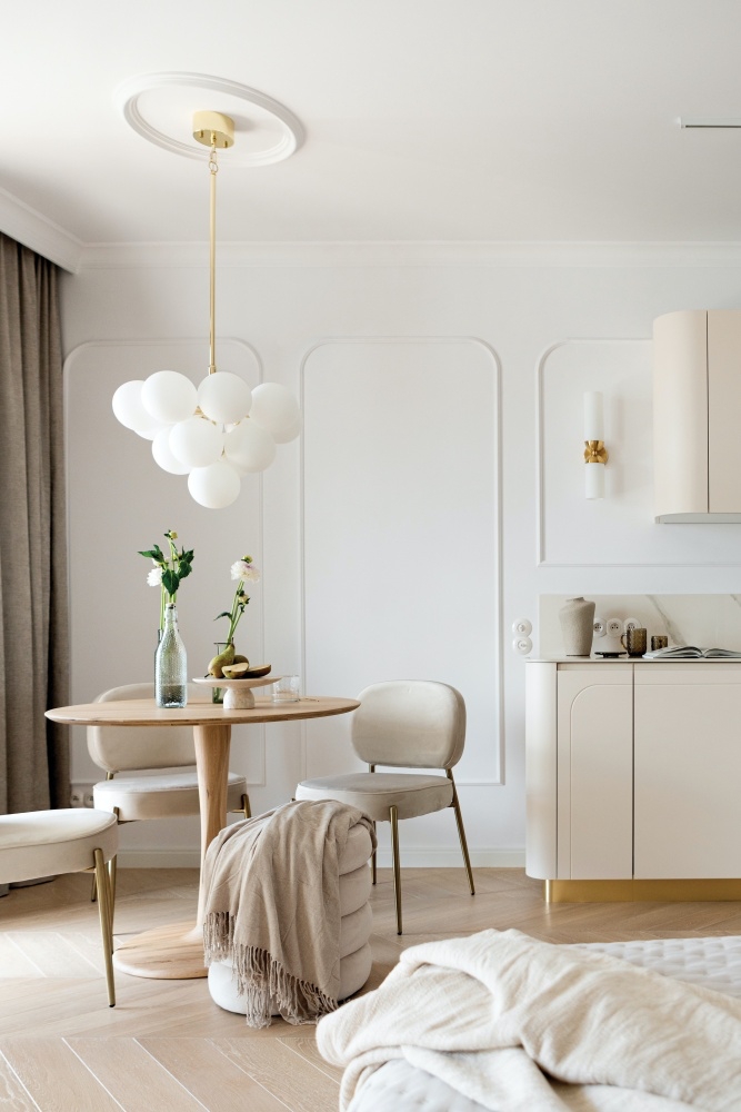 Warto zabezpieczyć ścianę przy stole przed zabrudzeniami i obijaniem krzesłami. Najlepiej, żeby materiał był odporny, trwały i estetyczny. Sprawdzą się ceramiczna farba, płytki, tapety...