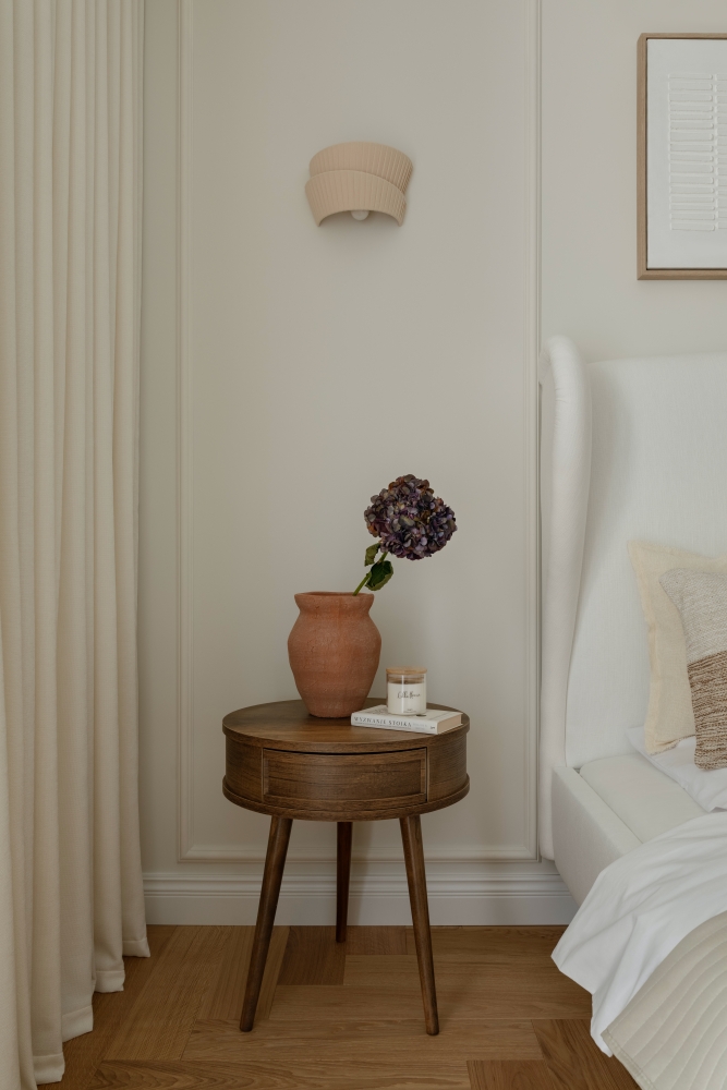 kaszmirowa sypialnia z drewnem