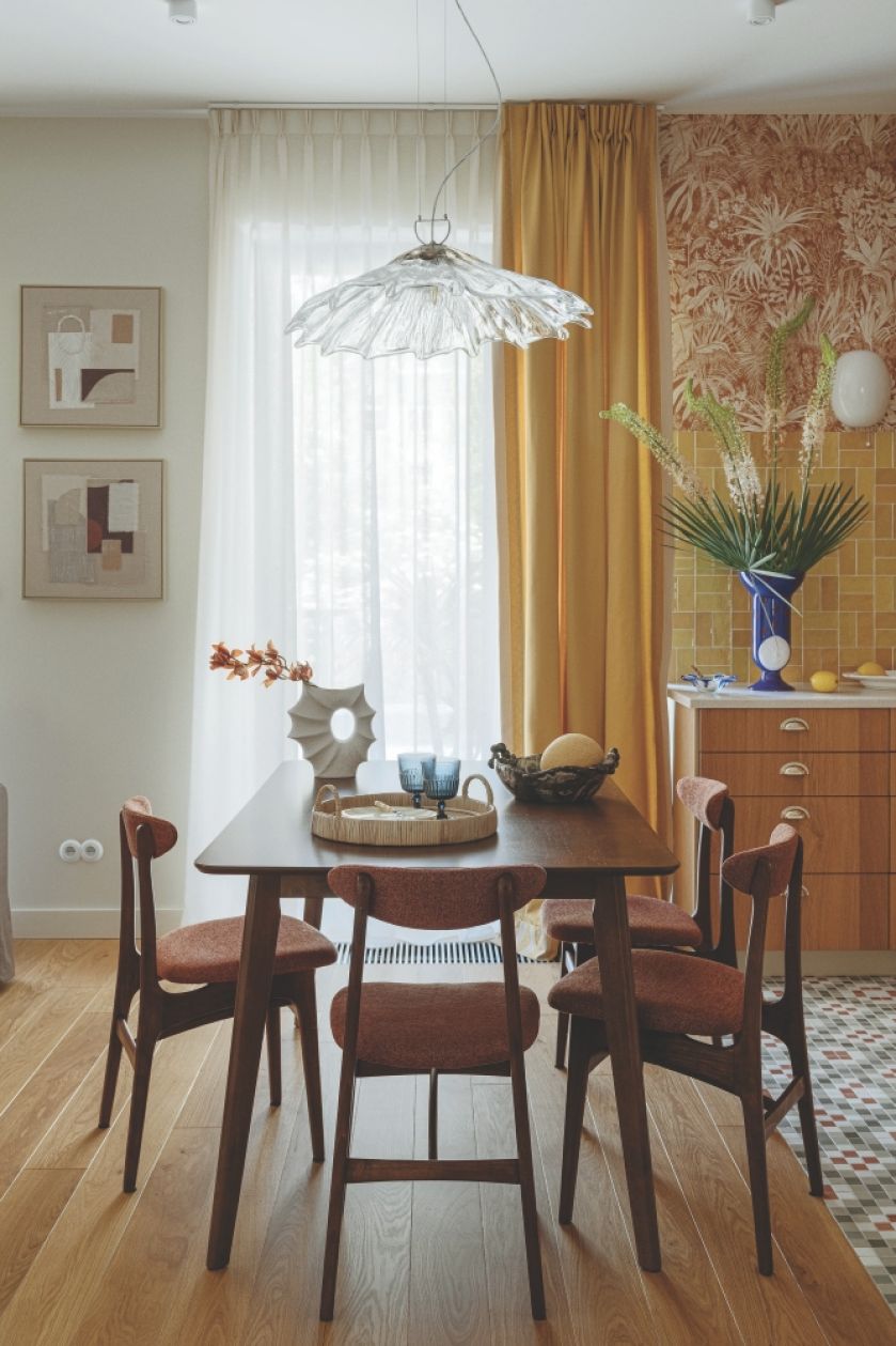 Małe mieszkanie w kolorach zachodzącego słońca – żółcienie, pomarańcze oraz dodatki retro na 45 m2