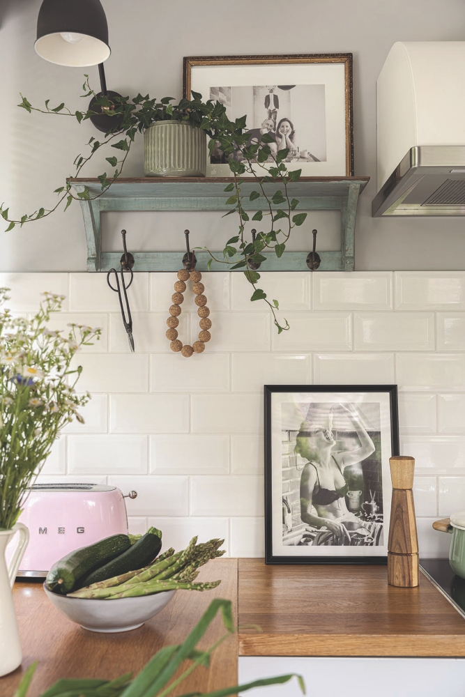 biała kuchnia z drewnianym blatem i zielonymi akcentami