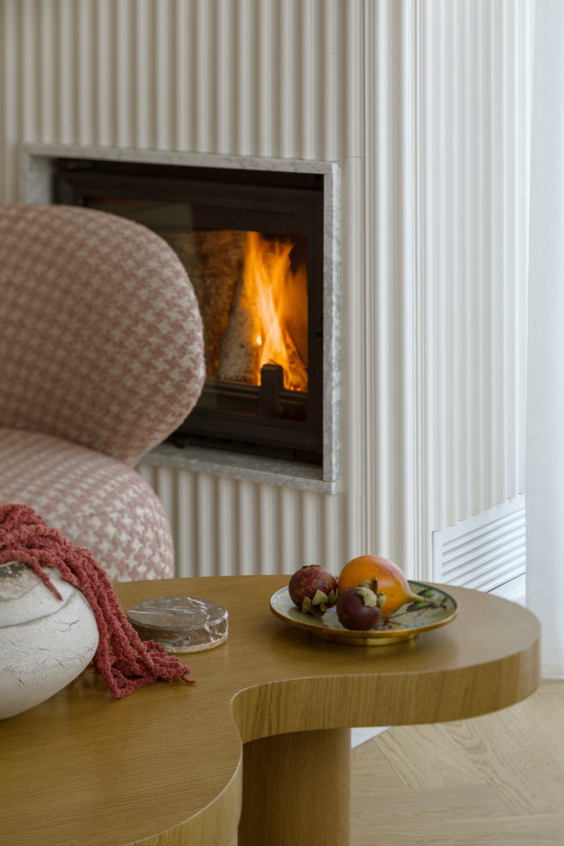mieszkanie z kominkiem i ryflowanymi meblami