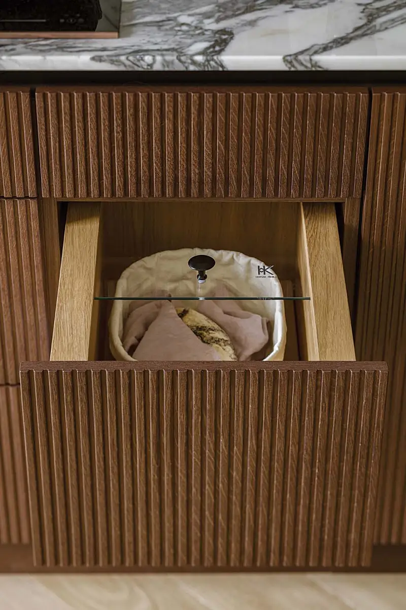 Od uchwytu do lodówki w kształcie gałązki po specjalnie zaprojektowaną szufladę na chleb – w każdym detalu to mieszkanie zachwyca stylem i funkcjonalnością.