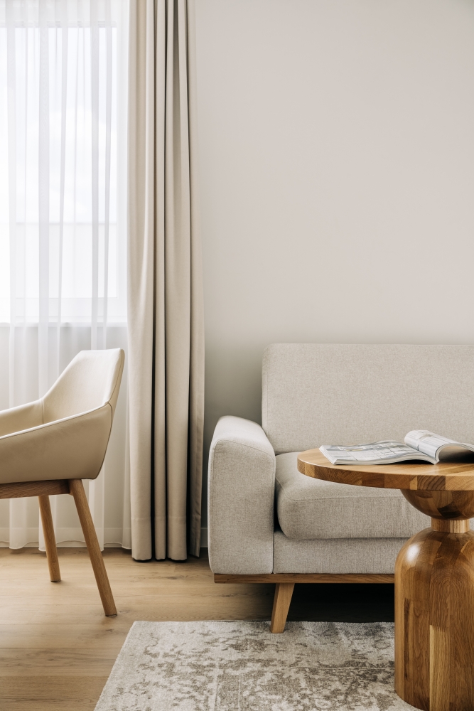 W pobliżu malowniczego parku krajobrazowego powstał komfortowy apartament. Nowoczesną przestrzeń wzbogacają stylowe detale, a odcienie bieli i granatu wprowadzają lekkość oraz wakacyjny klimat.