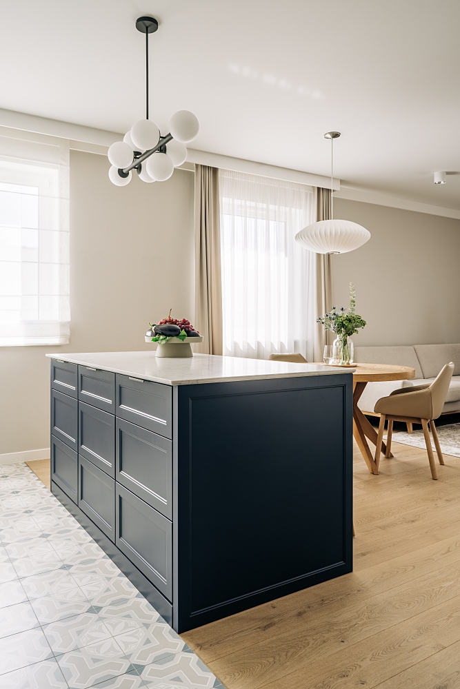 W pobliżu malowniczego parku krajobrazowego powstał komfortowy apartament. Nowoczesną przestrzeń wzbogacają stylowe detale, a odcienie bieli i granatu wprowadzają lekkość oraz wakacyjny klimat.