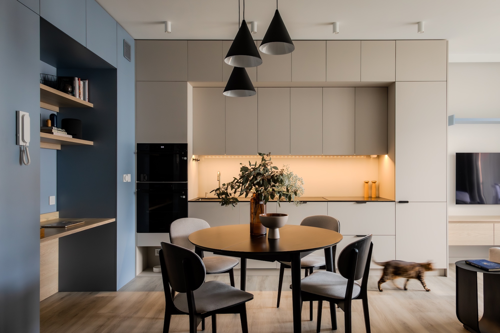 Małe mieszkanieTo niewielkie warszawskie mieszkanie zaprojektowane przez pracownię Maryny Bovkun jest świetnym przykładem subtelnej gry kontrastami. Stonowane beże przeplatają się tu z wyrazistymi błękitami, a ciepła dodają akcenty pomarańczy. Mały metraż nie przeszkodził architektom w stworzeniu stylowego, przytulnego i wygodnego miejsca dla trzyosobowej rodziny, a nawet ich czworonożnego pupila. Zobaczmy jakie patenty zastosowali by wszystkim mieszkało się komfortowo i wygodnie.