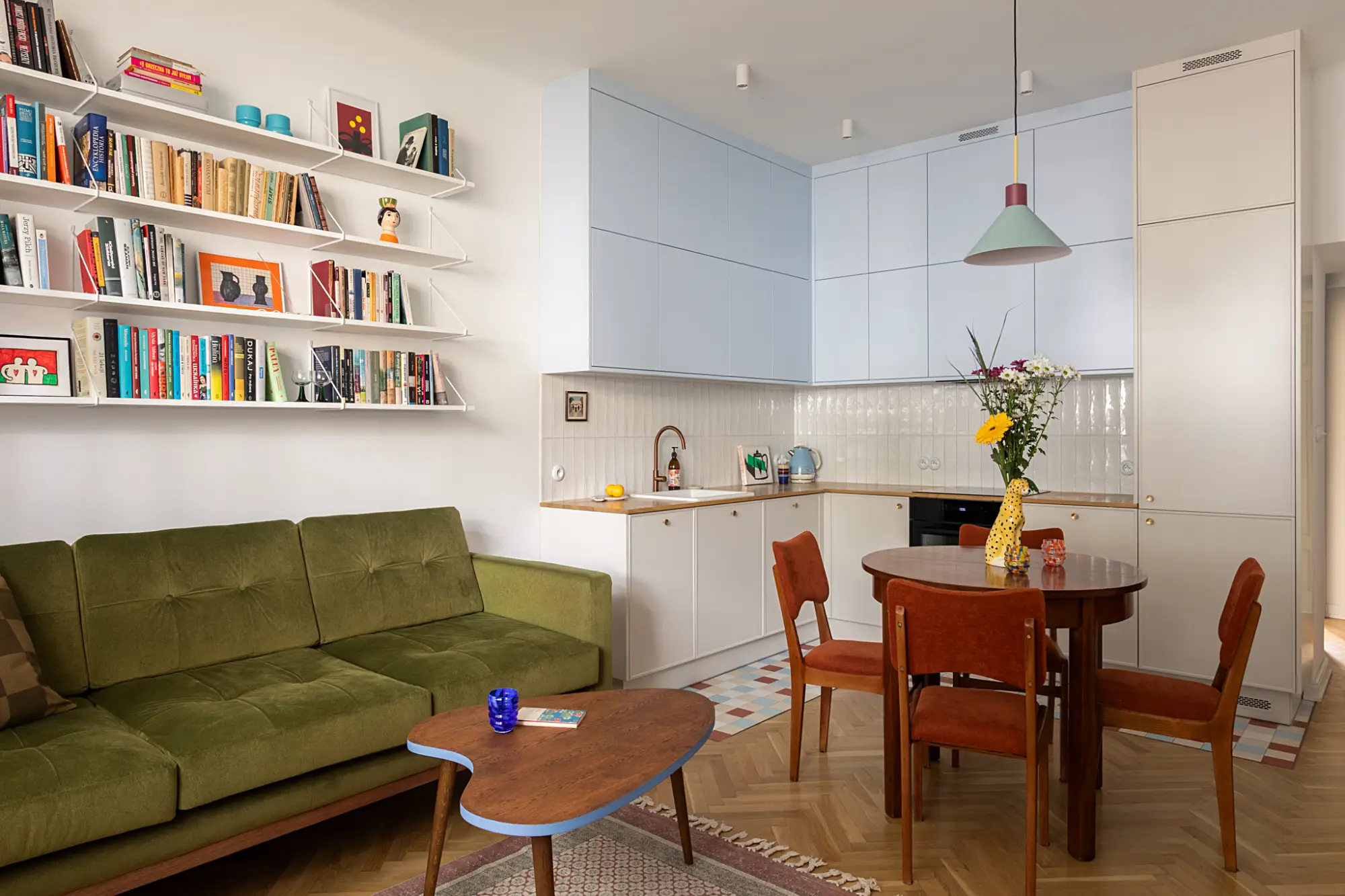 Mieszkanie 62 m2 w modernistycznej kamienicy na warszawskim Żoliborzu – z oryginalnym parkietem i meblami z lat 50. XX w.