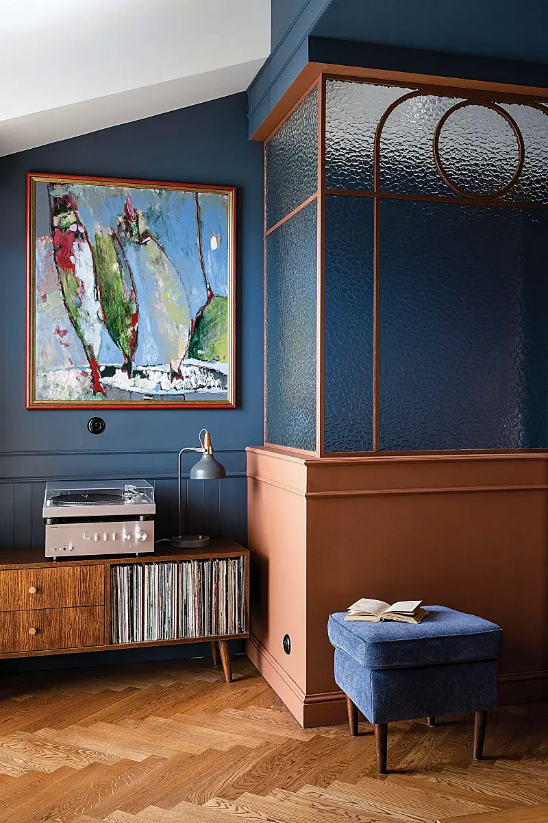 Kolorowe mieszkanie urządzone z fantazją! Są w nim miejsce do relaksu pod schodami, biblioteka z barkiem i kolekcja winyli