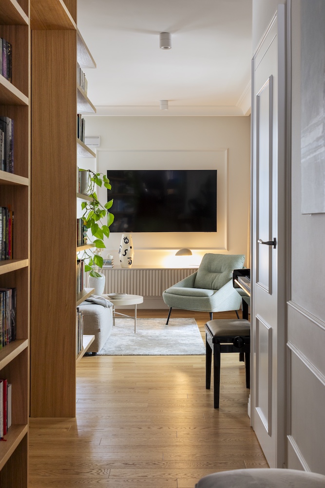 Gdzie tapety oprawiono w sztukaterie, a salon ozdobiono... biblioteką – stumetrowe mieszkanie w stylu modern classic