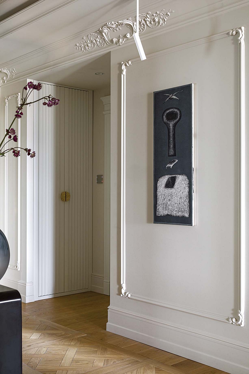 • elegancki przedpokój ze sztukaterią na ścianach