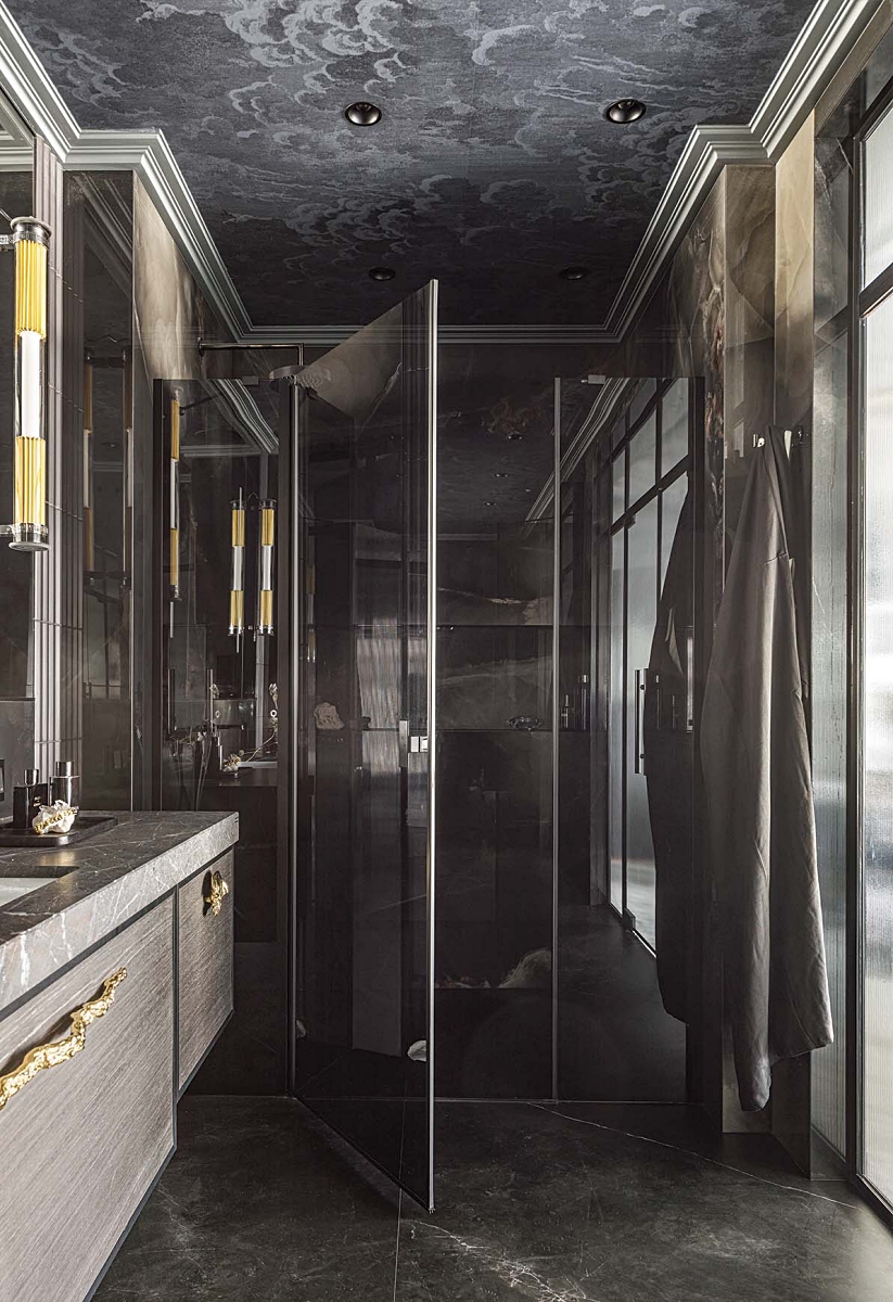 • łazienka z ciemną zabudową i nastrojowym oświetleniem
