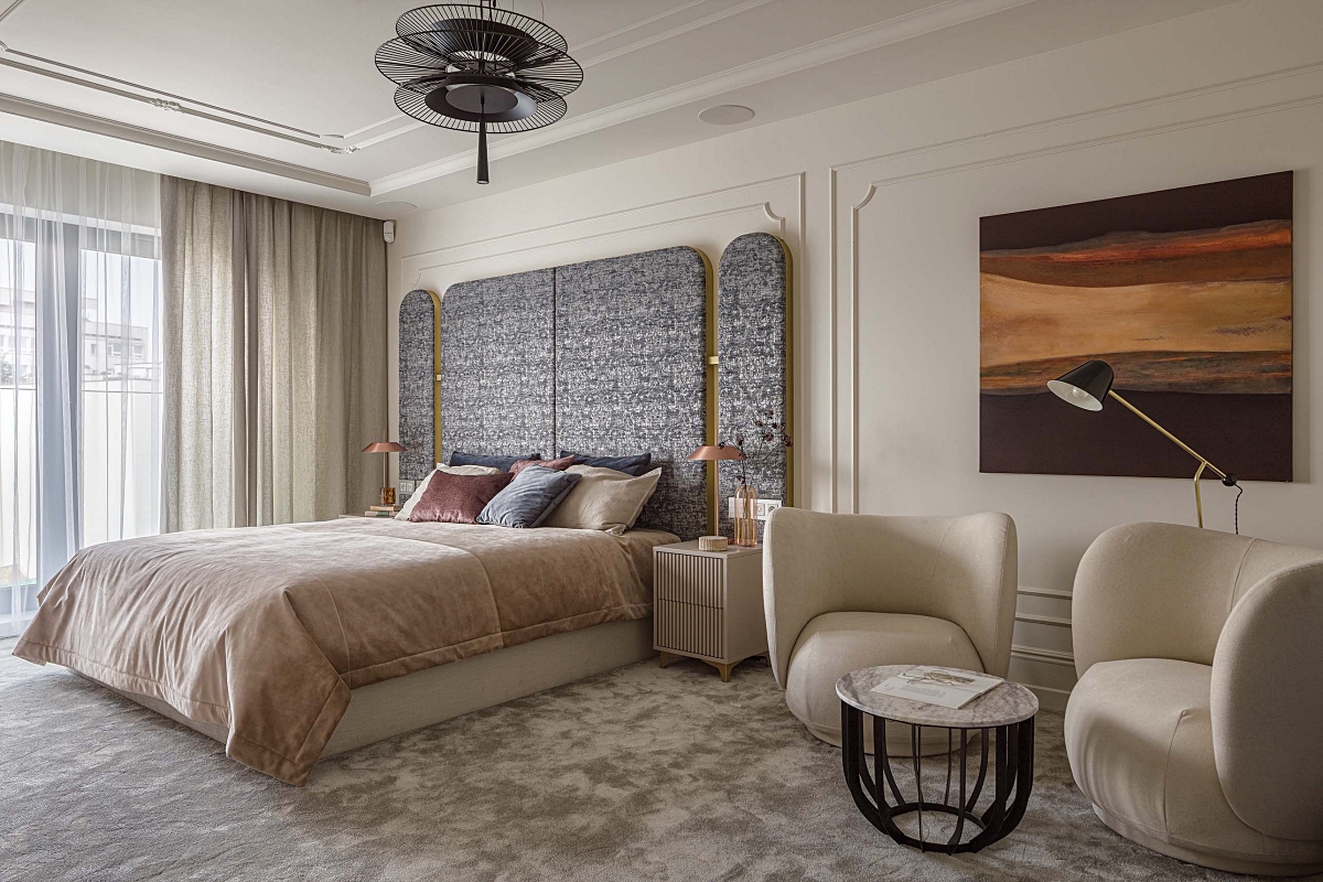 sypialnia w beżach i szarościach z dużym łóżkiem z tapicerowanym wezgłowiem
