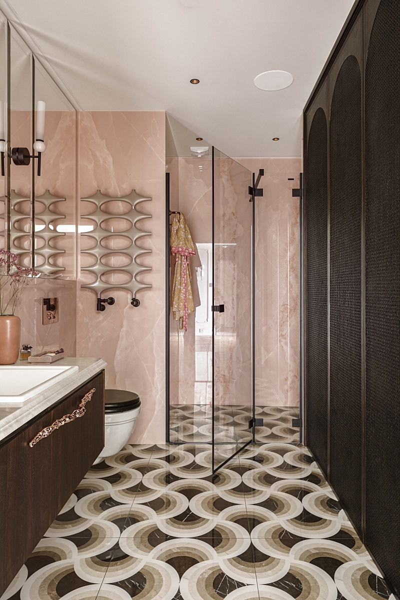 • łazienka z ciemną zabudową i nastrojowym oświetleniem
