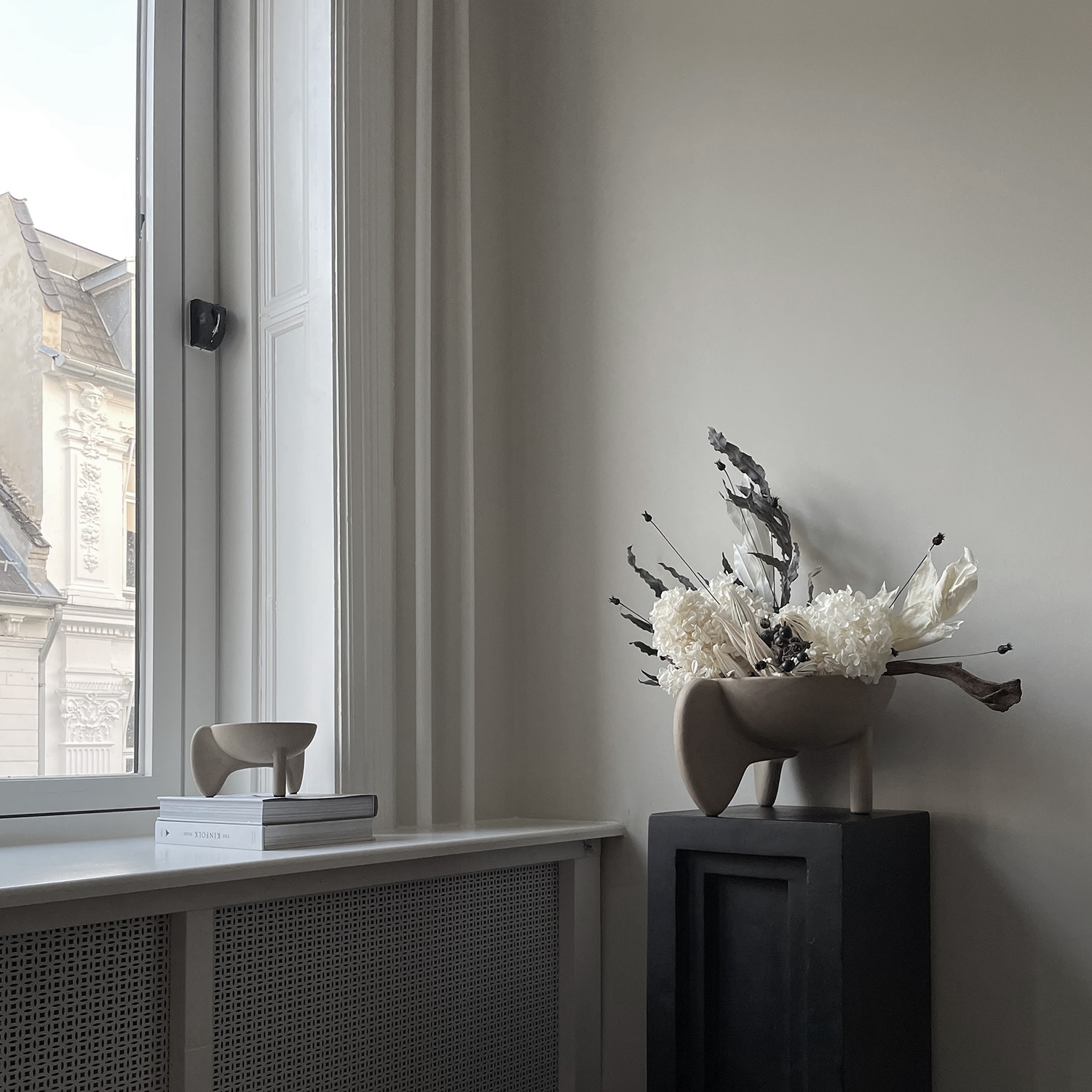 sztuczne kwiaty w designerskim wazonie