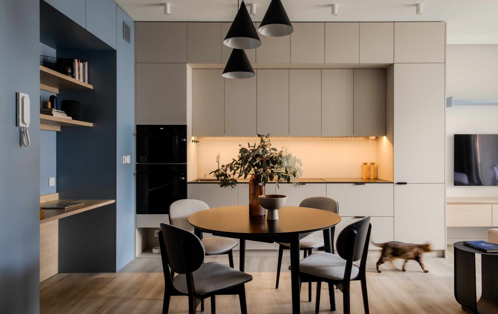 Jak urządzić przytulne 55 m2? Nowoczesne mieszkanie w odcieniach piaskowych beżów i błękitnych jeansów