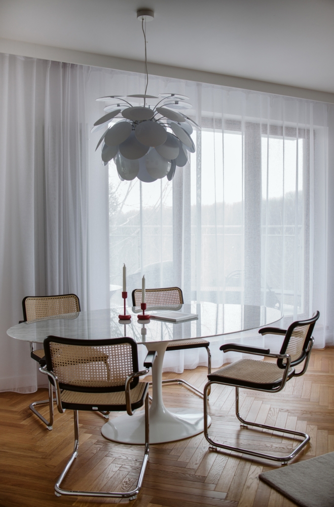 • jadalnia w stylu mid-century modern w mieszkaniu na bielanach