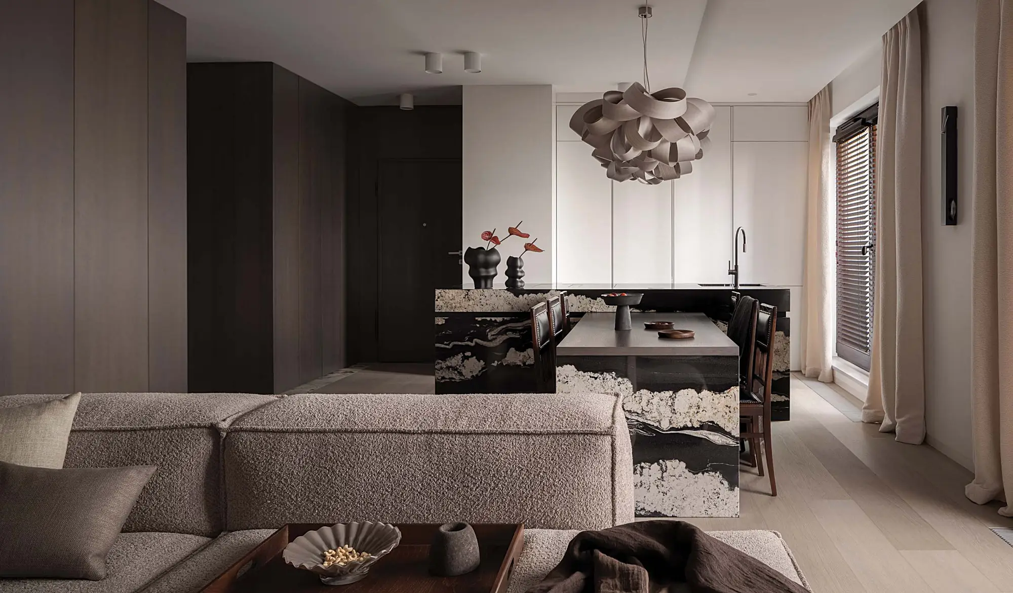 Jak urządzić ponad stumetrowy apartament w Porcie Praskim? Projektantka połączyła minimalizm z dekoracyjnym kwarcytem, dymionym szkłem i meblami z duszą. To wnętrze, które zaskakuje!