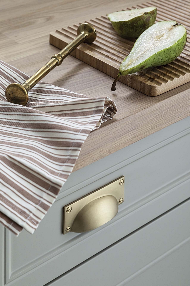 • beżowa kuchnia z drewnianymi blatami i mosiężnymi uchwytami