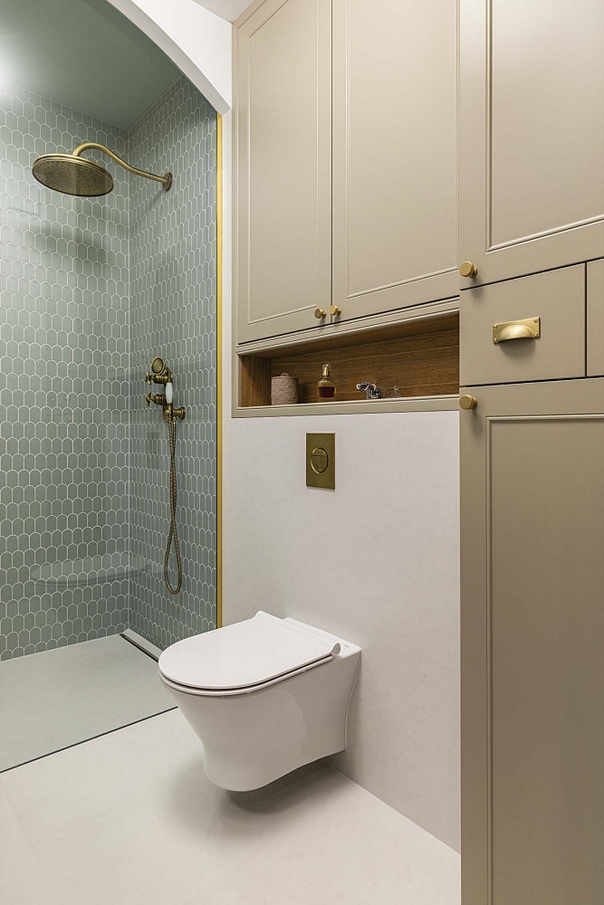 • łazienka beżowa z zielonymi płytkami