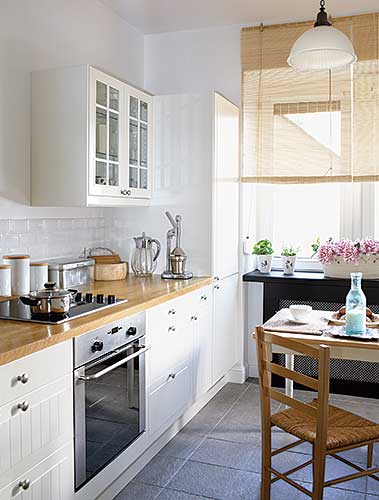 W jasnej kuchni są białe szafki. Dyskretny urok czerwieni