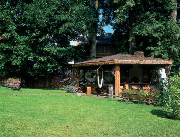 W cieniu wysokich drzew, pośród kwiatów - to idealne miejsce na przyjęcia w ogrodzie.