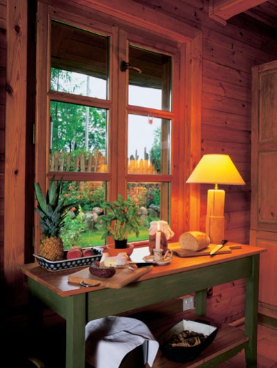 Drewniany barek sprawdza się jako kuchenny blat pod oknem.