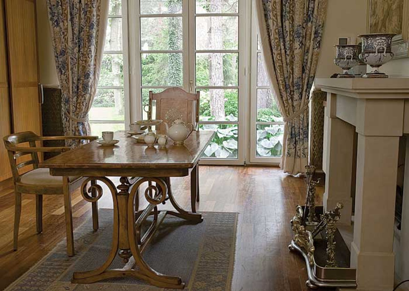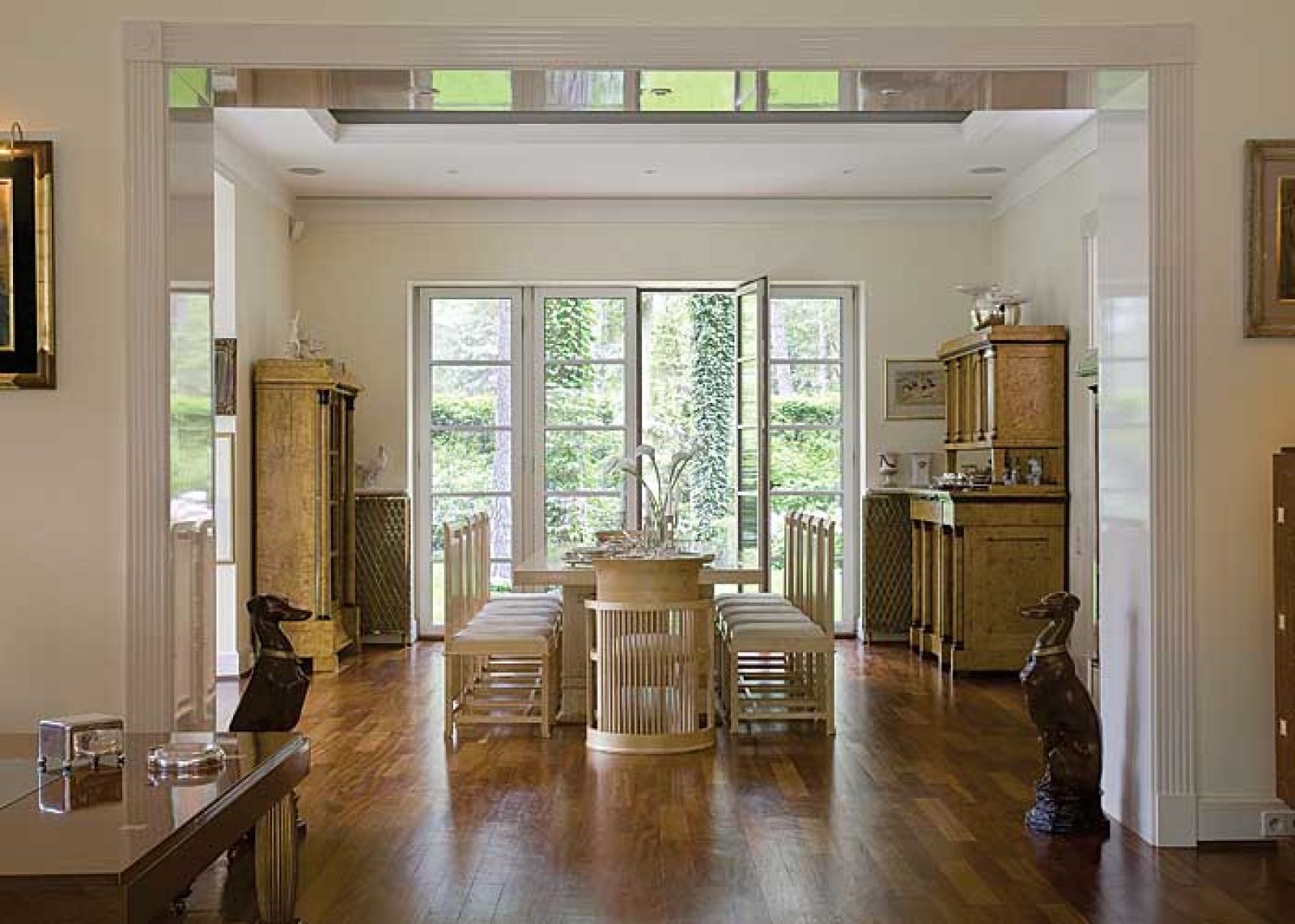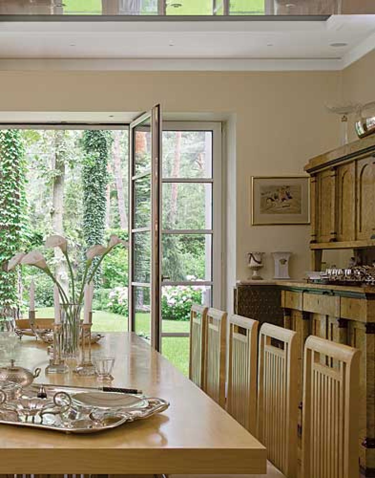 W jadalni sekretery i kredensy w stylu biedermeier stoją obok stołu i krzeseł – replik mebli słynnego architekta Franka Lloyda Wrighta. Właściciele zamówili je we włoskiej manufakturze specjalizującej się w produkcji mebli wzorowanych na klasykach modernizmu.
