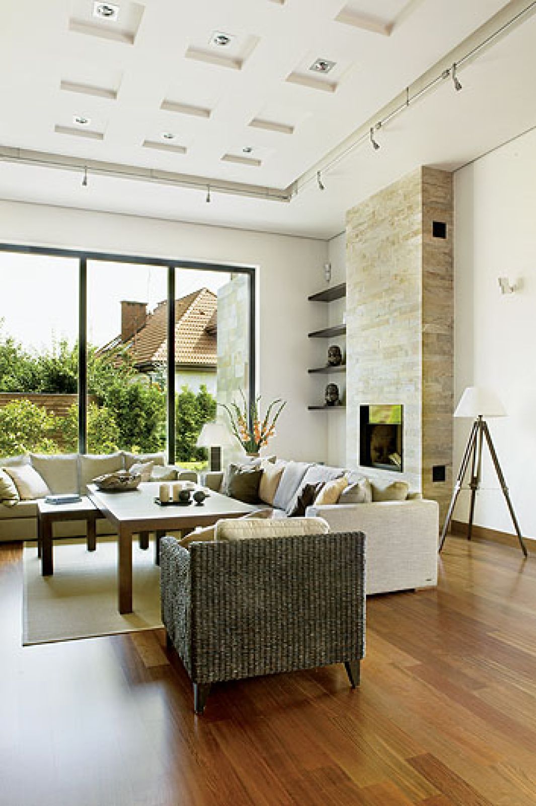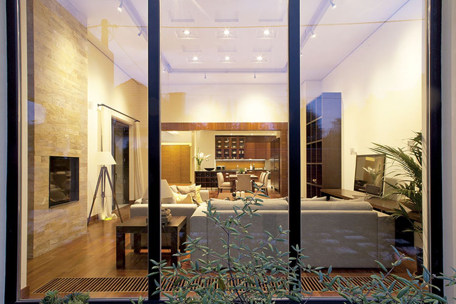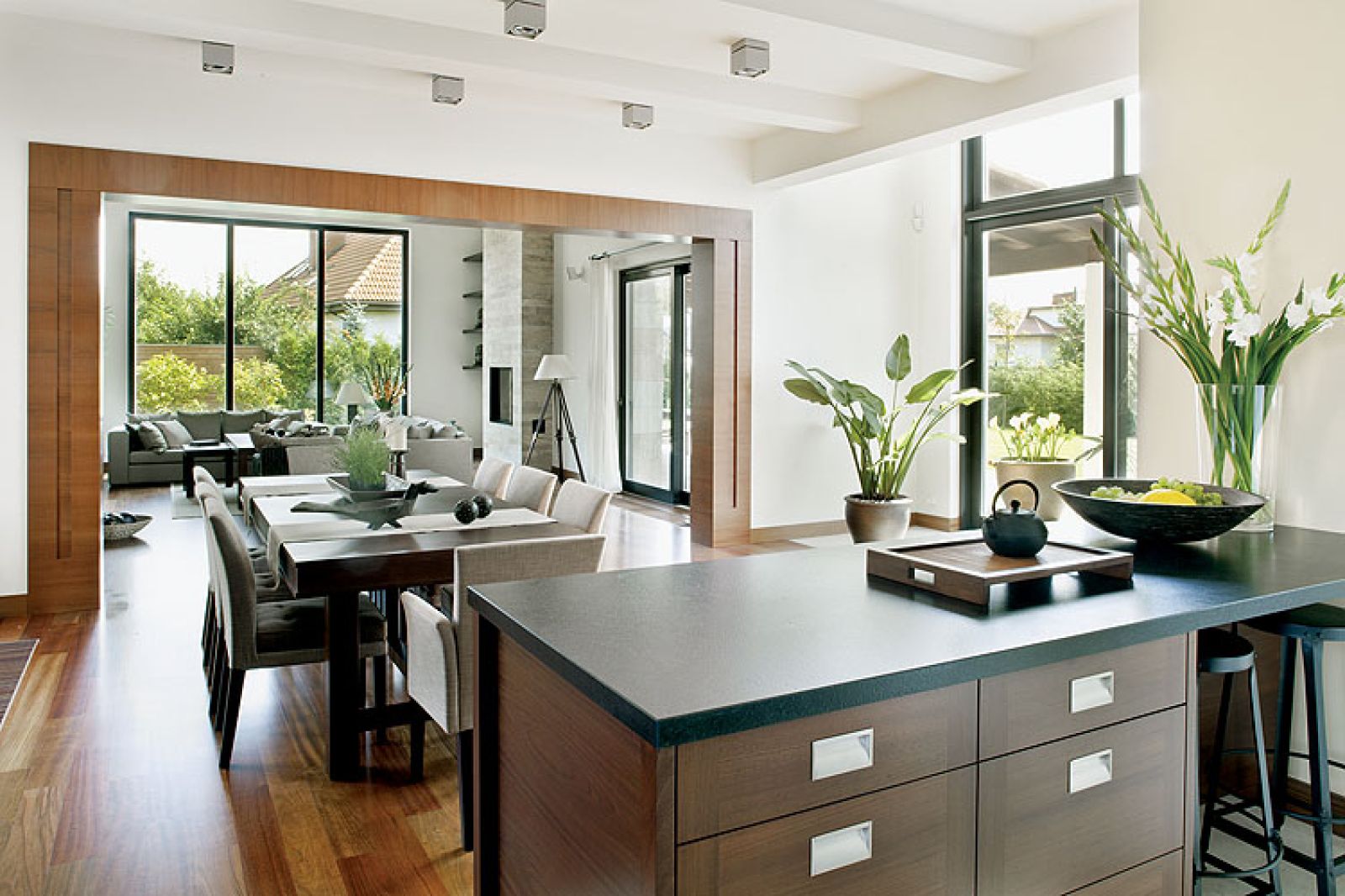 Od ulicy nic nie zapowiada tego, co kryją dom i ogród. Zielony nawet zimą żywopłot ze szlachetnych cisów jest kurtyną, która skutecznie broni prywatności. Możemy podziwiać wiodące do domu kamienne tarasy, kremowożółte magnolie (Magda: – Szukaliśmy tego odcienia kilka miesięcy, a potem drzewa przez pół roku czekały, aż będzie je można posadzić w ogrodzie) i dywany białych azalii, ale to wszystko. Po drugiej stronie domu podobne zadanie co cisy spełnia połyskująca w słońcu ściana z brazylijskiego łupka kwarcytowego. To, co najlepsze, mają okazję obejrzeć tylko przyjaciele. A jest na co popatrzeć.