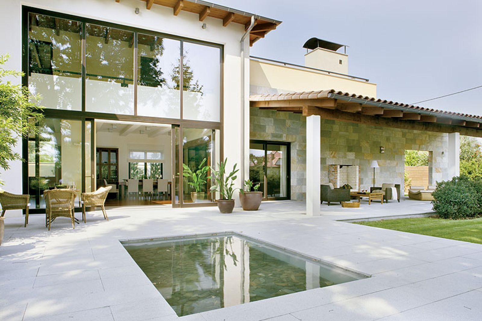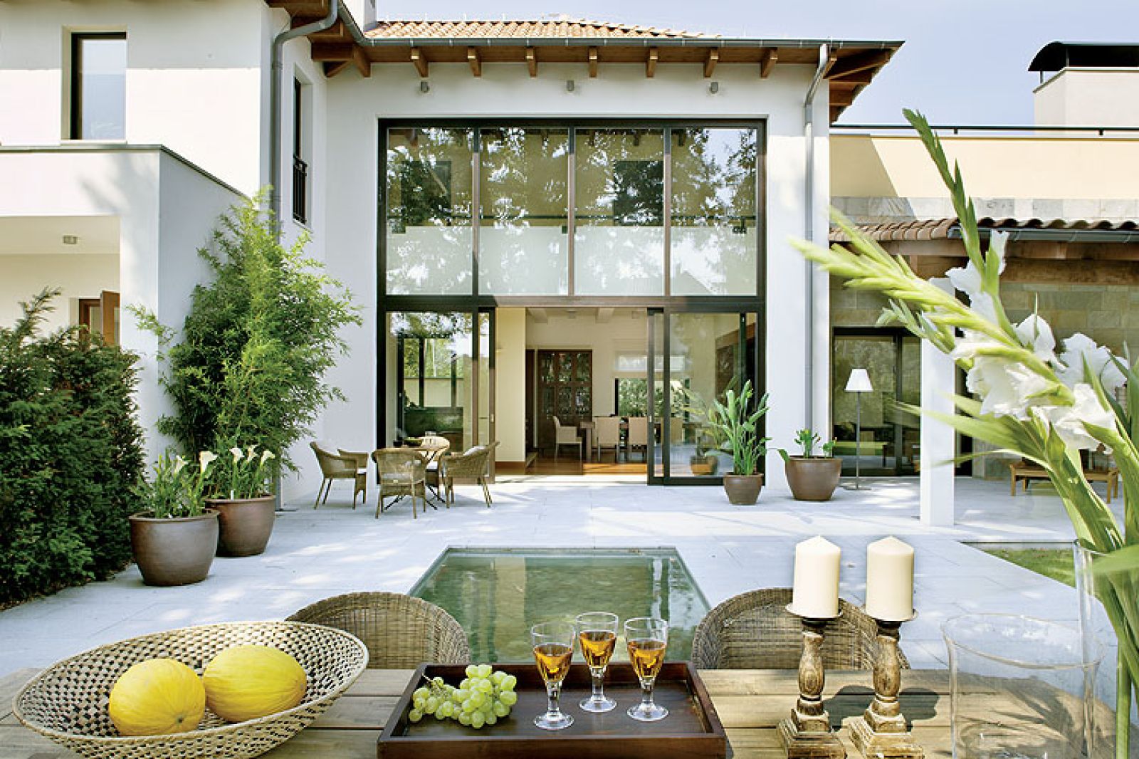 Życie toczy się na dwóch planach, które przenikają się i uzupełniają. Jeden to dom z widokami, a drugi – przestronny ogród. Pomiędzy nimi malownicze tarasy, jak w śródziemnomorskiej willi. Na wysokości jadalni otoczony jasnoszarym kamieniem niewielki basen, przy którym można szukać wyciszenia po pracy. Tuż za szklaną ścianą – letni zakątek kawiarniany obsadzony bambusami. Obok salonu z kominkiem – zielony living room z fotelami, leżankami i dekoracyjnymi, egzotycznymi strelicjami – ich kwiaty przypominają rajskie ptaki. Wrażenie potęgują kolory, które ze sobą „rozmawiają”: elewacja ma odcień śmietankowy, jak magnolie, murki są kremowe i pomarańczowe, podobnie jak liliowce. Do tajlandzkich donic wsadzono kremowe i żółte kalle. – W Afryce Południowej rosną w rowach, jak u nas kosaćce – opowiada Magda. – Kwitną miesiącami, a potem wciąż wyglądają efektownie, bo ich kielichy zielenią się do późnej jesieni.