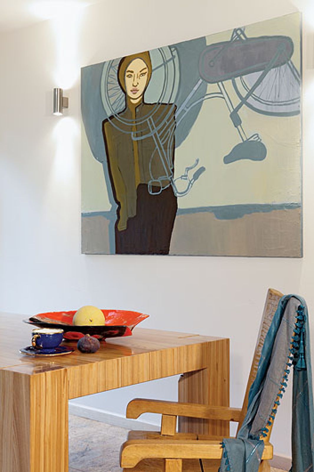 Przestronny, wyczyszczony z detali dom okazał się idealną galerią. Choć nie jest po brzegi wypełniony dziełami sztuki, to te, które tu są, tym bardziej zwracają uwagę. Obrazy, autorstwa zaprzyjaźnionej z gospodarzami Marii Markiewicz, powstały z myślą o tym miejscu. Niektóre – jak grafiki przy wejściu – są z domem związane nierozerwalnie, bo namalowane bezpośrednio na murze.