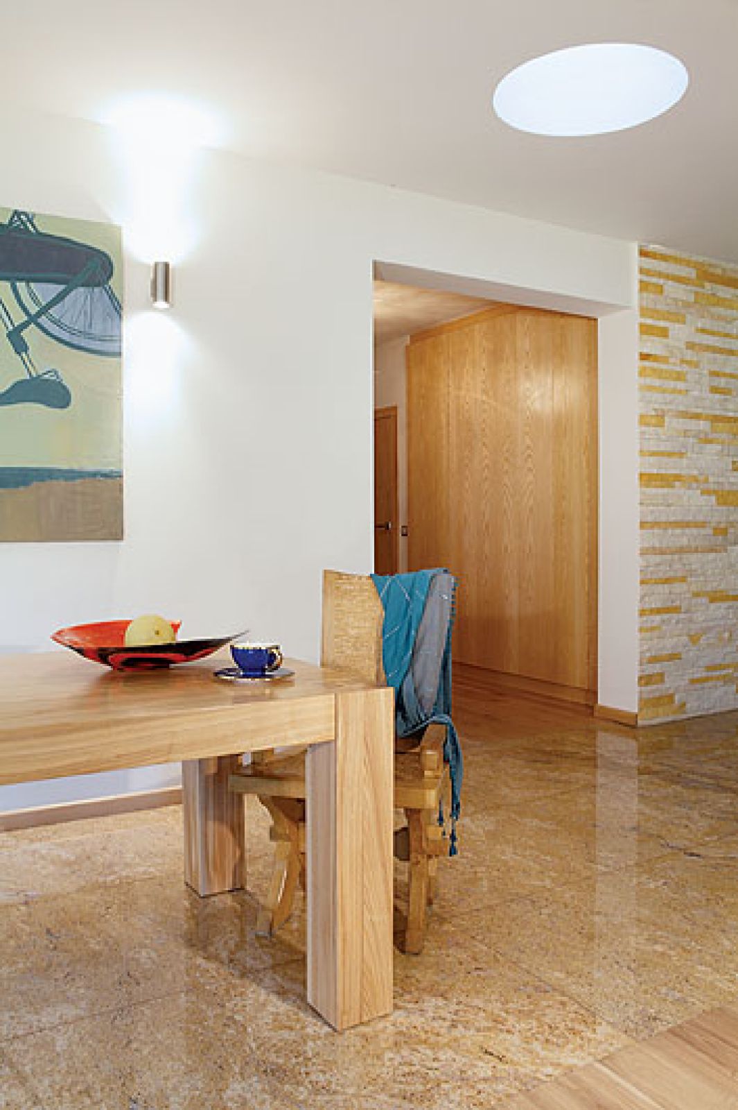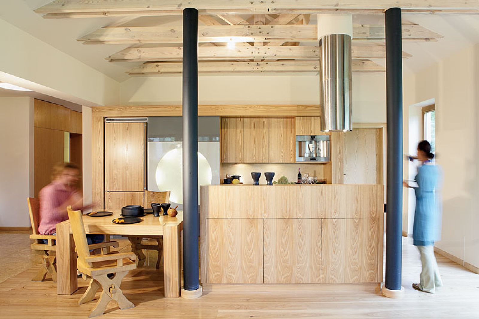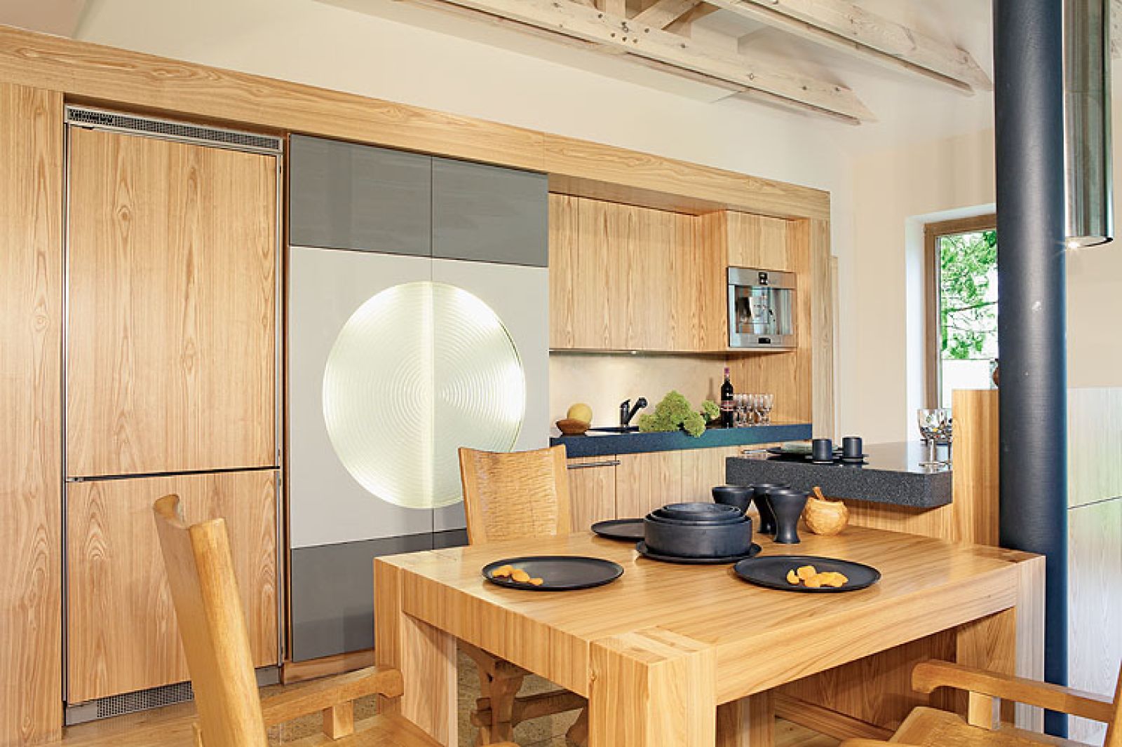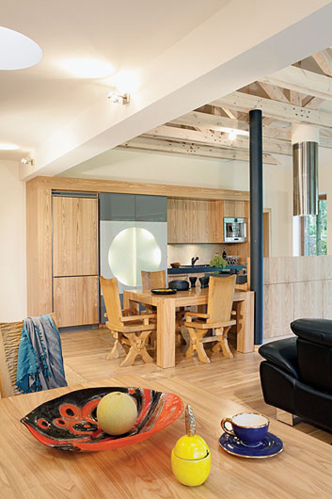 Pomogły w tym meble z białego jesionu (z tego samego drewna jest też podłoga w salonie) i nowoczesny, intrygujący styl zabudowy. Sprzęt wybitnie kuchenny wygląda jak jedno z wielu dzieł sztuki (na przykład okap) albo wtapia się w tło (żeliwna kuchnia zamontowana na czarnym granitowym blacie). Wszystko nawiązuje do siebie kształtem: kuchenna wentylacja ma przekrój koła, podobnie jak świetliki w suficie holu i jadalni. Motyw koła pojawia się również na podświetlanej tafli szkła na froncie kuchennej szafy oraz w łazience dla gości (umywalka i rama lustra nad nią).