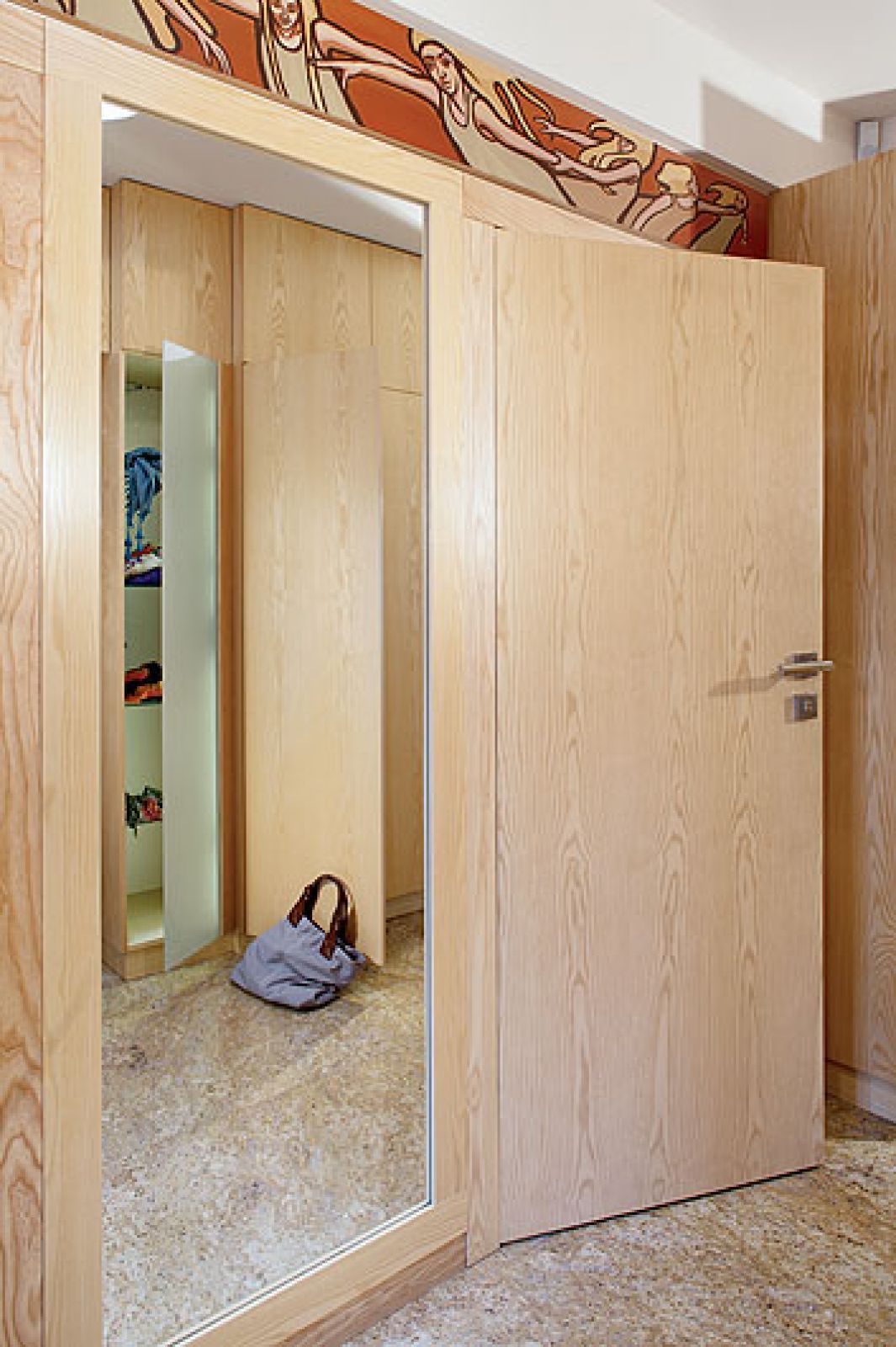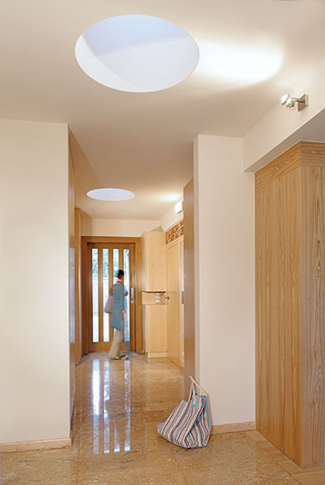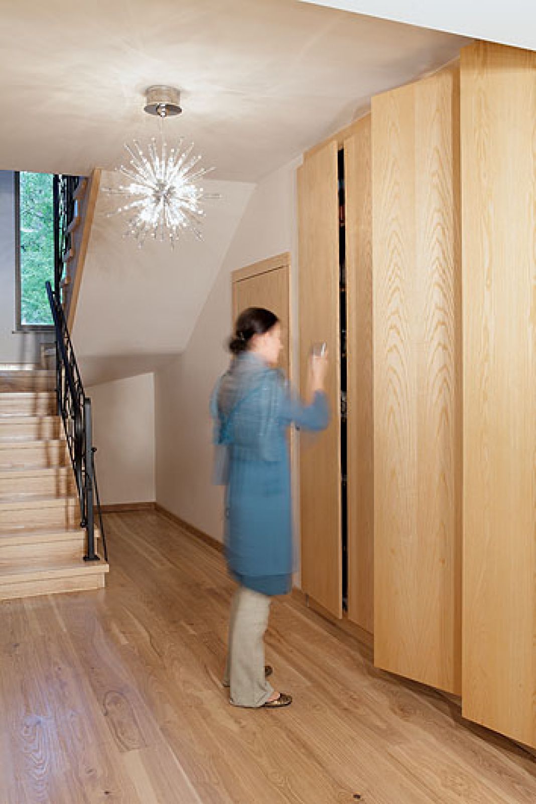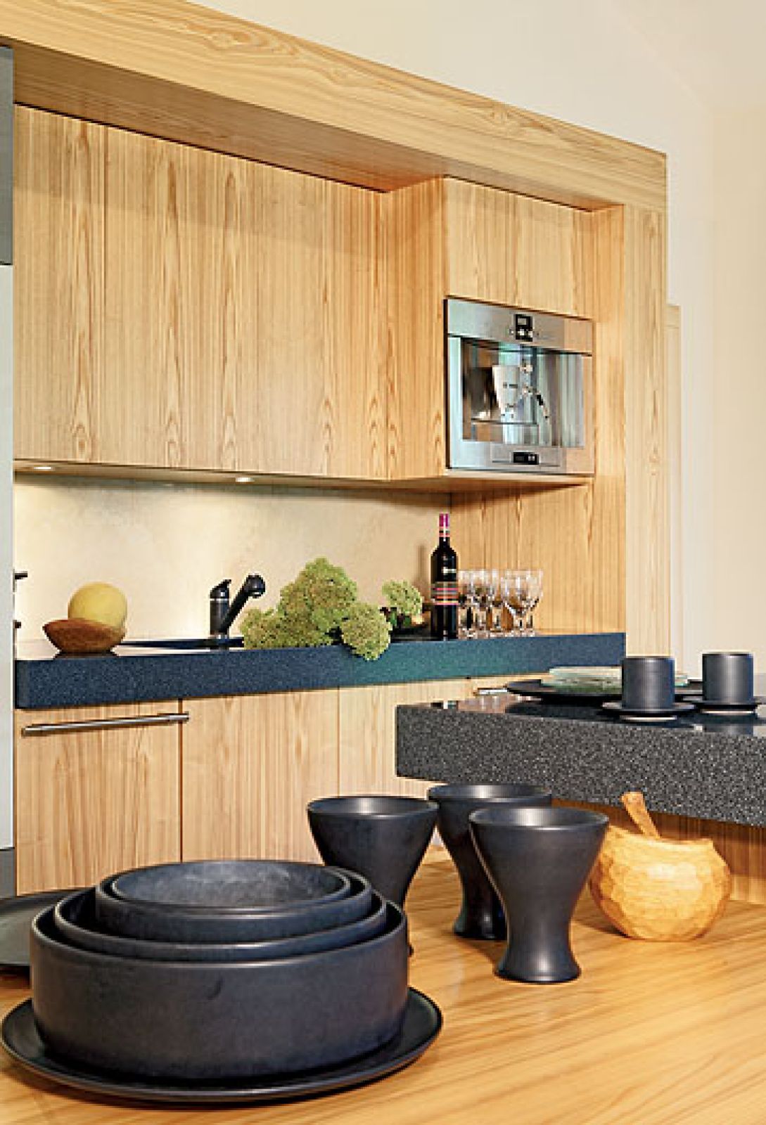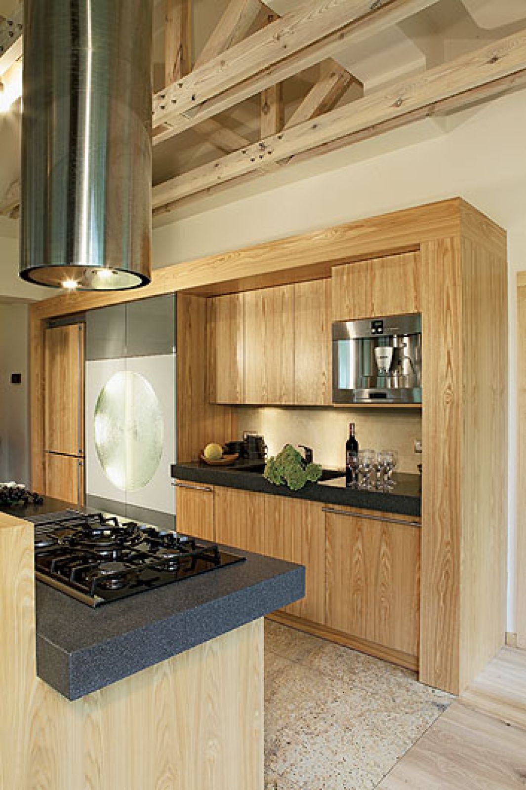Pomogły w tym meble z białego jesionu (z tego samego drewna jest też podłoga w salonie) i nowoczesny, intrygujący styl zabudowy. Sprzęt wybitnie kuchenny wygląda jak jedno z wielu dzieł sztuki (na przykład okap) albo wtapia się w tło (żeliwna kuchnia zamontowana na czarnym granitowym blacie). Wszystko nawiązuje do siebie kształtem: kuchenna wentylacja ma przekrój koła, podobnie jak świetliki w suficie holu i jadalni. Motyw koła pojawia się również na podświetlanej tafli szkła na froncie kuchennej szafy oraz w łazience dla gości (umywalka i rama lustra nad nią).