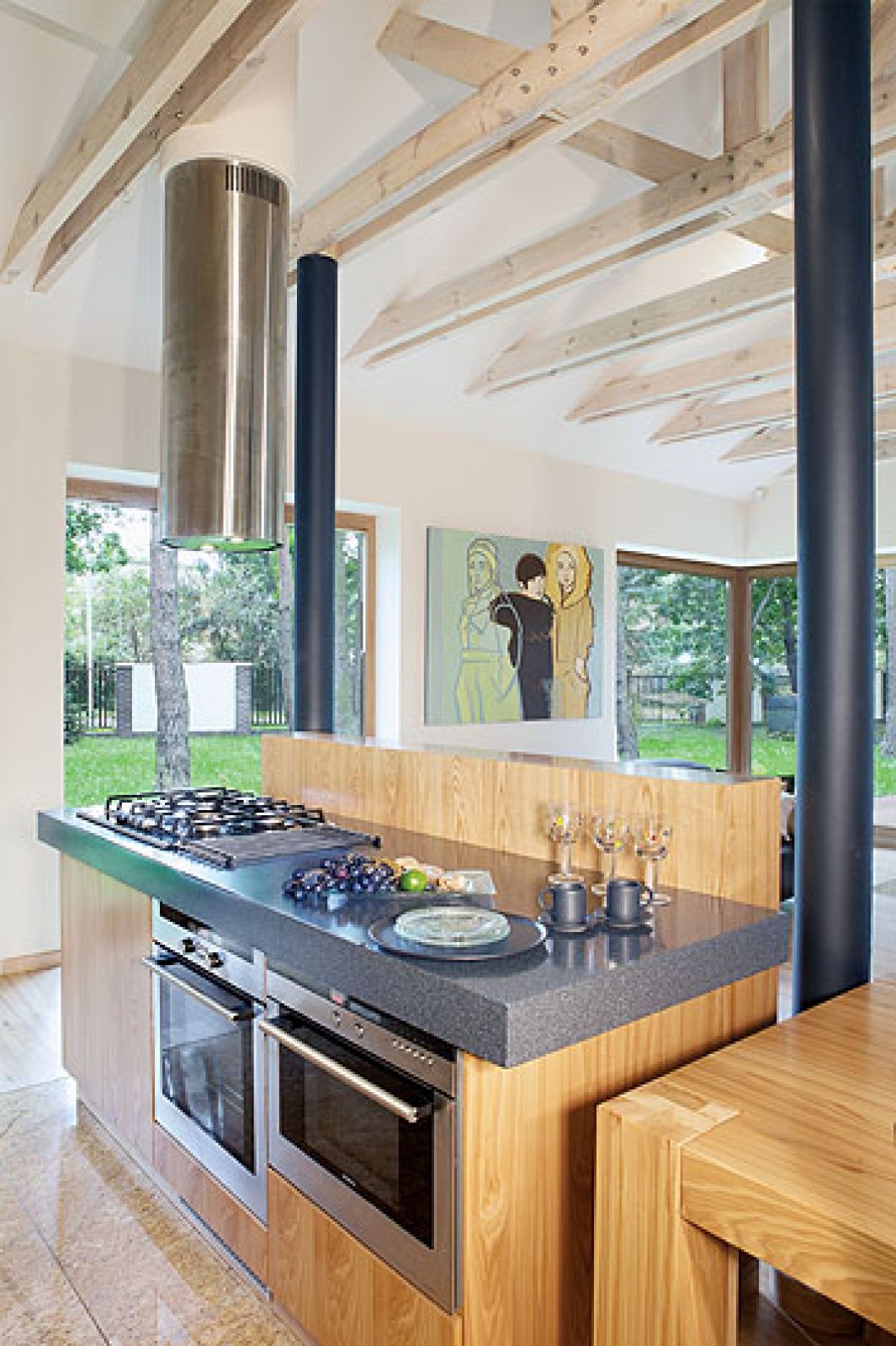 Parter domu to otwarta przestrzeń z salonem i obłożonym cegłami z piaskowca kominkiem pośrodku. – Dla równowagi: kuchnia pomyślana tak, by nie kojarzyła się ze standardową – w końcu jest otwarta na salon – ale spełniała wszystkie jej funkcje – mówi Karolina Pawłowicz.