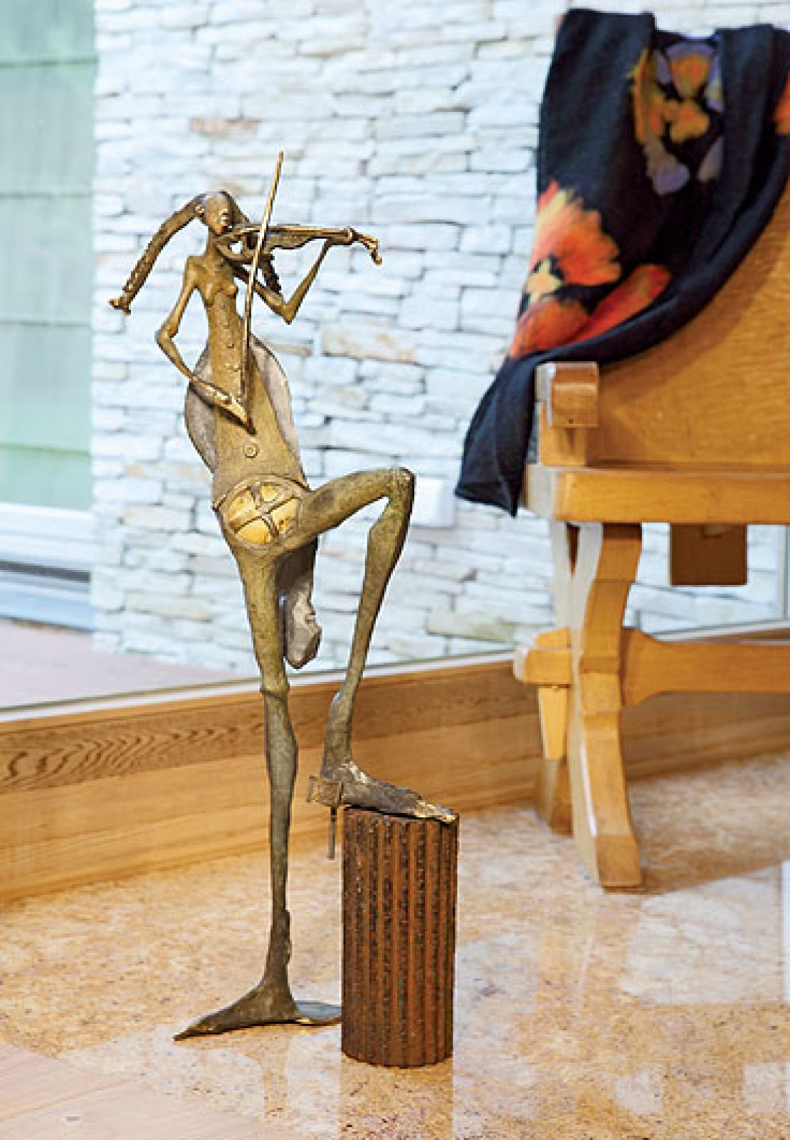Artystyczny klimat budowały też niestandardowe, niefabryczne przedmioty. Stapiany metodą fusion szklany element dekoracyjny w kuchni i nawiązujący do niego wzór na oparciach krzeseł w jadalni są niczym kolejne eksponaty w tej domowej galerii. A do tego bardzo dobrze łączą się z prawdziwą sztuką, choćby rzeźbą Dariusza Zielińskiego, która przedstawia skrzypka. Ale ponieważ już na początku właściciele obiecali sobie, że ich dom będzie „czysty” i wolny od wizualnego chaosu, dbają, by nawet sztuki nie było tu zbyt wiele. Tym bardziej że natura za oknem nie skąpi wrażeń i ciągle się zmienia.