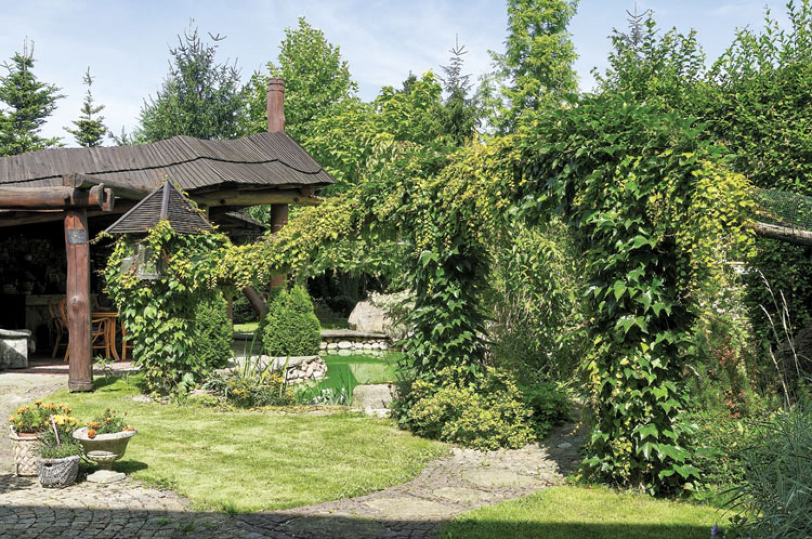 Zza smukłej sekwoi wygląda fragment metalowej konstrukcji – to stara bramka piłkarska. – Tu właśnie było boisko – opowiada Grażyna. – Syn przez lata trenował z kolegami piłkę nożną, rozgrywali mecze. Gdy junior wyrósł z futbolowej pasji, miejsce zajął ogród.