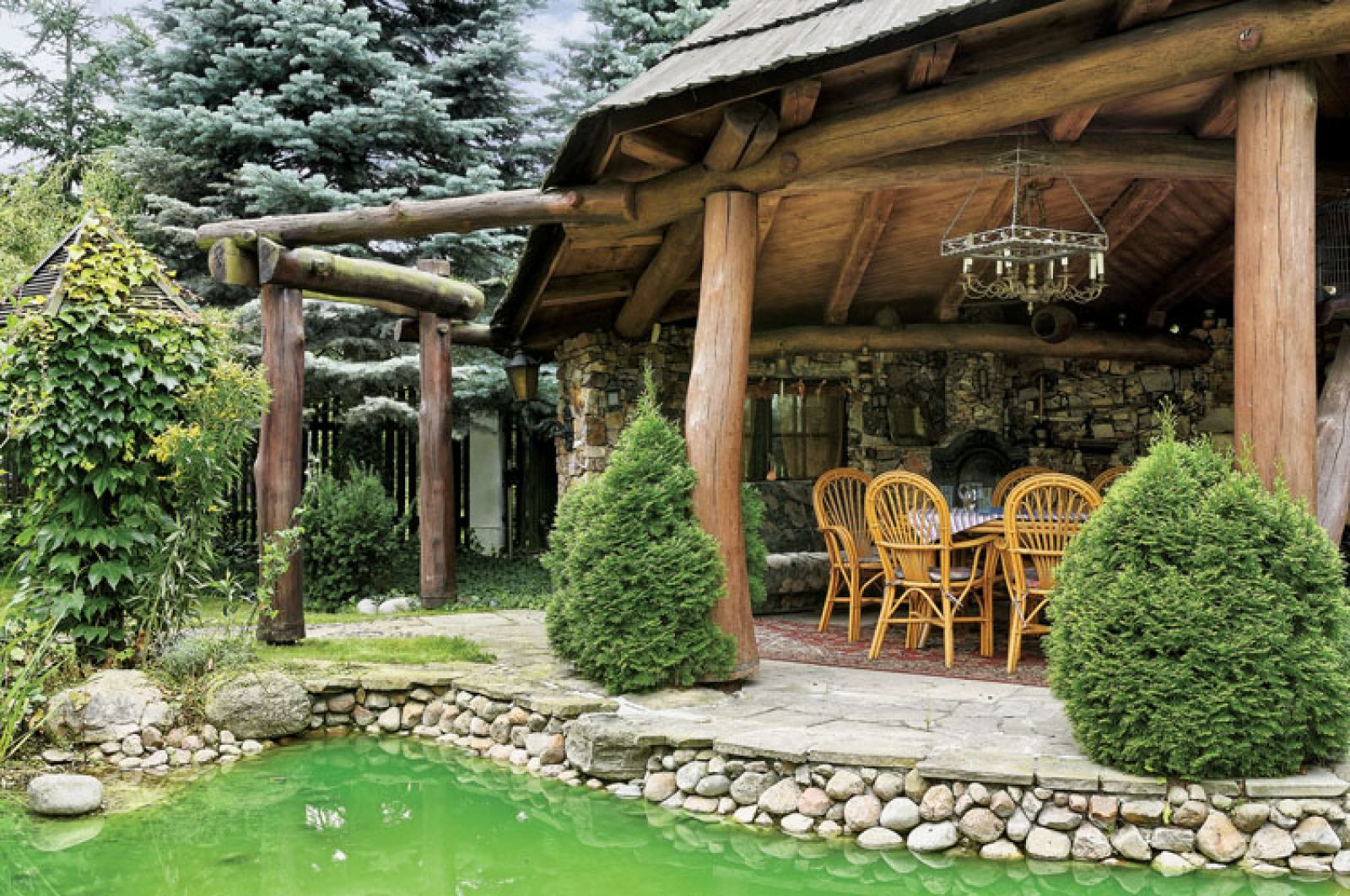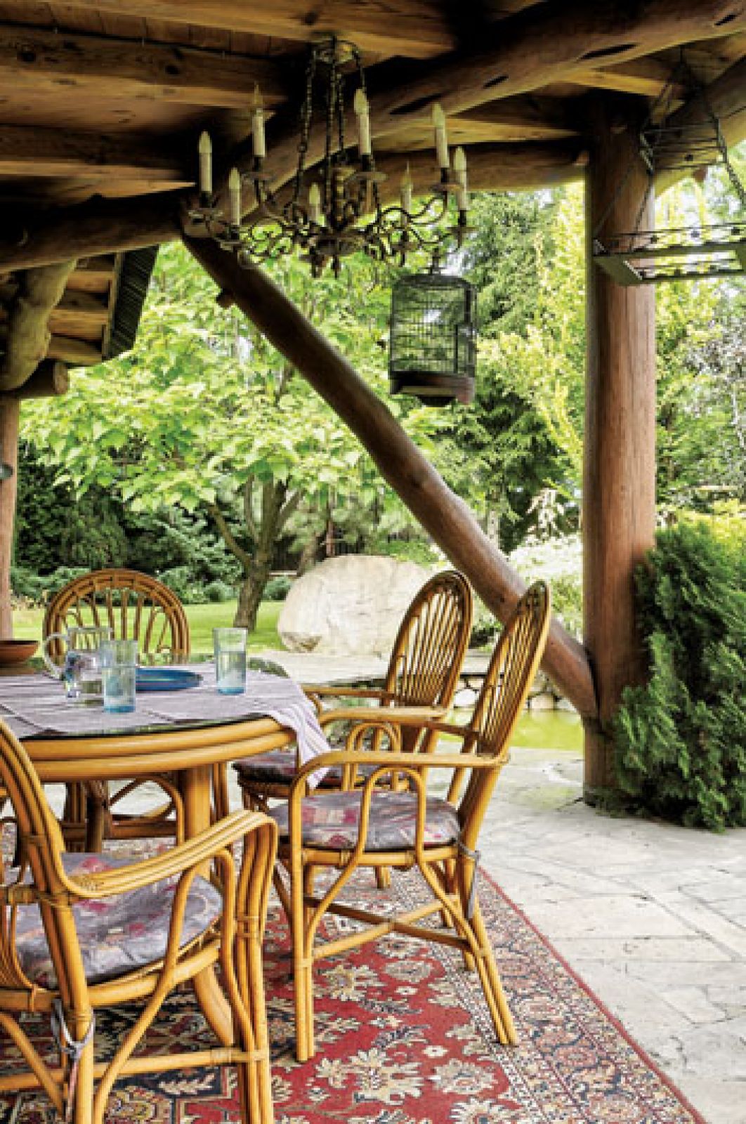 Pokój, który powstał w ogrodzie specjalnie dla przyrządzania przysmaków przywiezionych z wakacyjnych wojaży, najpierw miał być skromnym miejscem na grill, a stał się salonem pod chmurką z kamienia i drewna. Gdy mieli już gotowy projekt, znajomy leśnik biegał z rysunkami po lesie i wyszukiwał dęby na szkielet misternej konstrukcji.