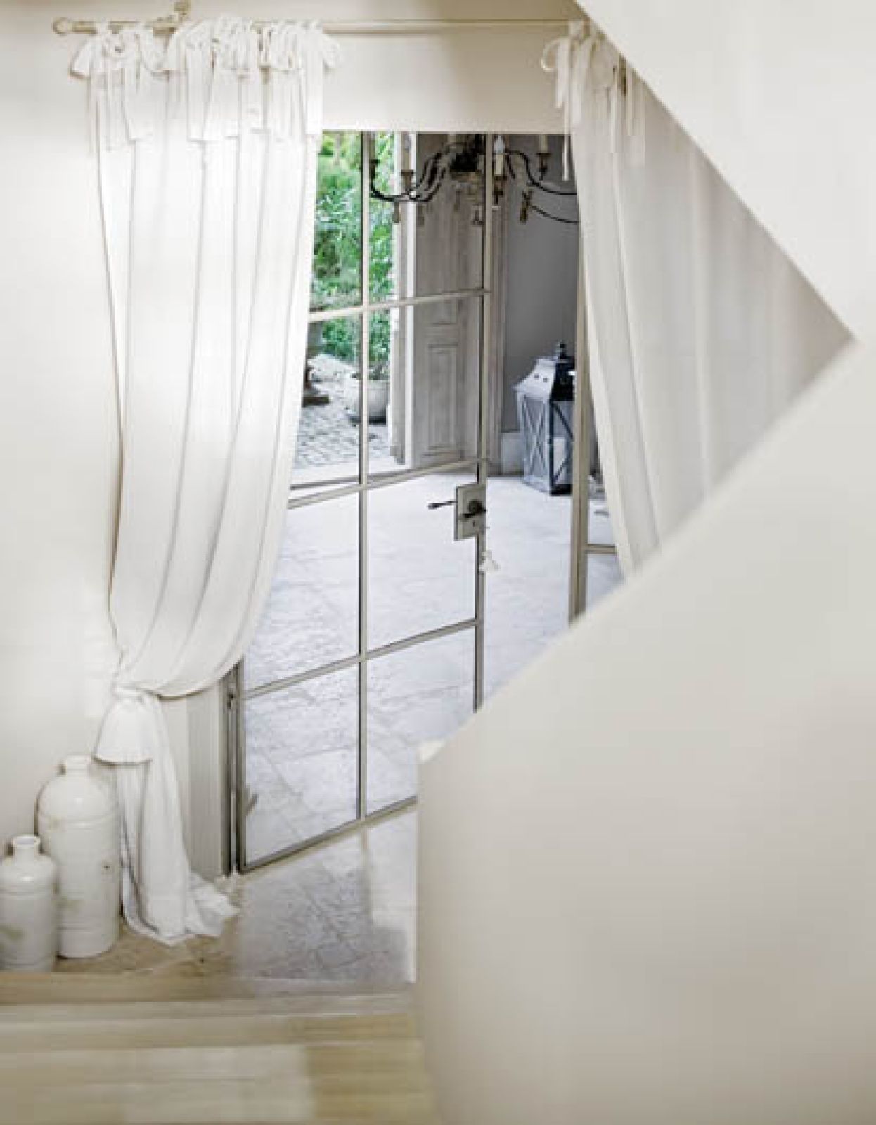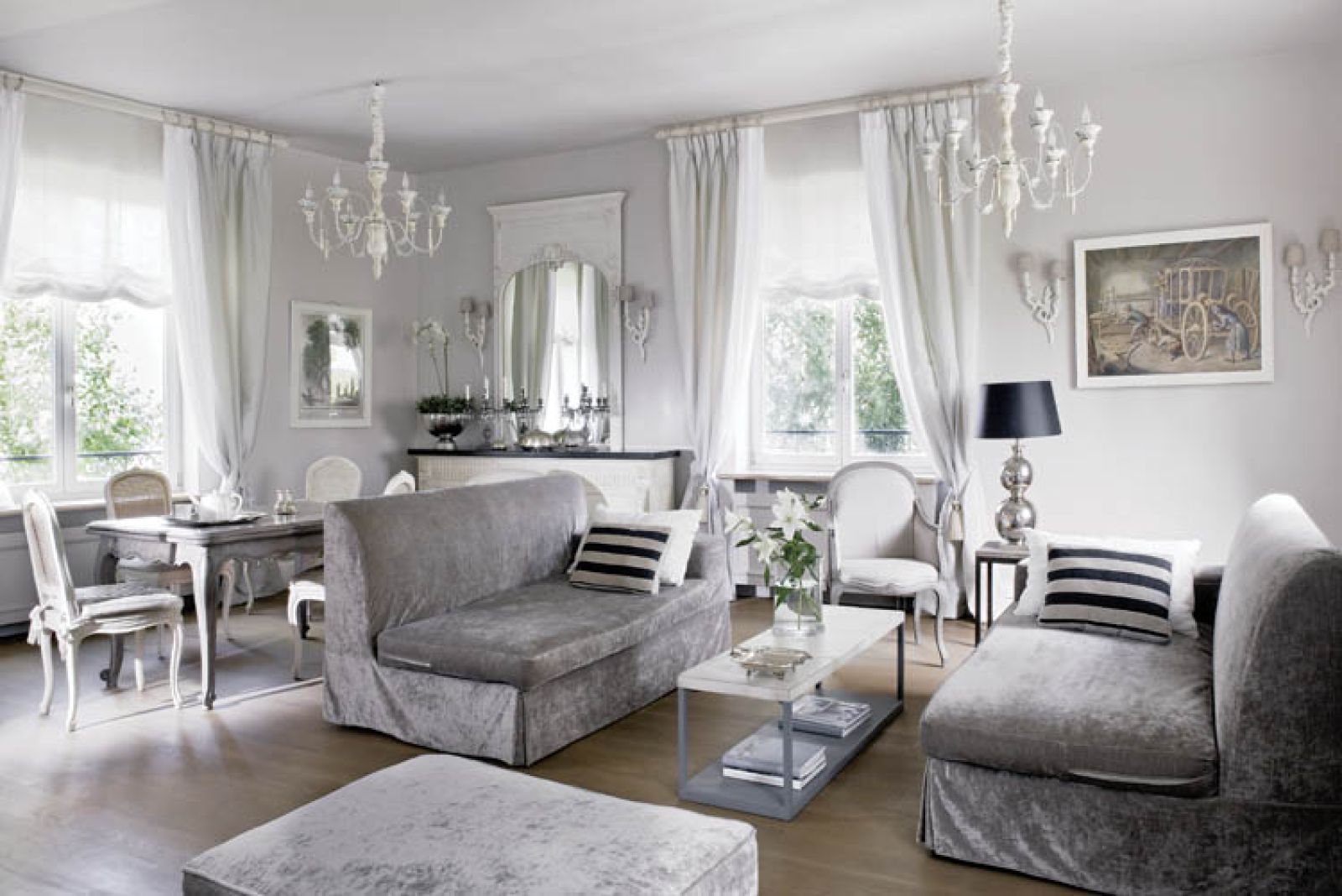 Żyrandole sprowadziła z Francji i Belgii (można je kupić w galerii Maison Creative). Gdzieniegdzie chłodnym blaskiem lśnią niklowane i chromowane wazy, kandelabry, lampy. Tłem dla tego, co błyszczy, są matowe powierzchnie: olejowany na szaro dąb na podłodze, pudrowe ściany. Żeby wnętrze nie wyglądało jak w pałacu, projektantka zrezygnowała z gzymsów, a meble obiła lekko gniecioną, nowoczesną tkaniną Fadini Borghi. – Uwielbiam materiały, którymi można się bawić. Na przykład len z miedzianą nicią, surowy i bardzo plastyczny. Formuję go dłońmi w niezwykłe kształty, a potem patrzę z zachwytem, jak w zakamarkach tkaniny nagle pojawia się światło lub cień.