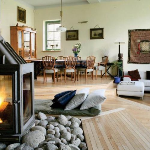 Bywa, że gdy rodzina jest w komplecie, wybuchają sprzeczki o wygodną miejscówkę przy „kozie”. To najlepszy kąt do czytania, a w tym domu namiętnie czytają wszyscy. Na szczęście wygodnie rozsiąść się można nie tylko przy piecu. Kilka schodów w dół są równie przytulne kanapy i fotele. A tu najlepiej ogląda się filmy. Teraz wystarczy wcisnąć już tylko guzik na pilocie i z sufitu zjeżdża ekran, a żaluzje same zasłaniają okna. Prawie jak w kinie.