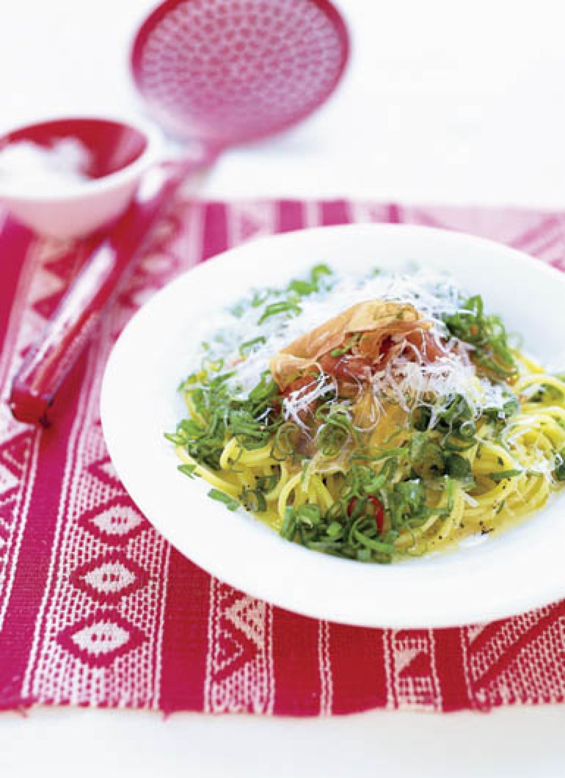 Makaron ugotuj al dente. Czosnek i białą część dymki pokrój w cienkie plastry, pietruszkę i szczypior drobno posiekaj. Rozgrzej w garnku 2 łyżki oliwy, wrzuć czosnek i dymkę, i smaż minutę, mieszając. Wlej bulion, odparuj połowę. Dodaj masło, zamieszaj i dopraw. Wrzuć ugotowany makaron i wszystko podgrzej. Rozłóż do głębokich talerzy, posyp utartym parmezanem, posiekaną zieleniną i skrop resztą oliwy.