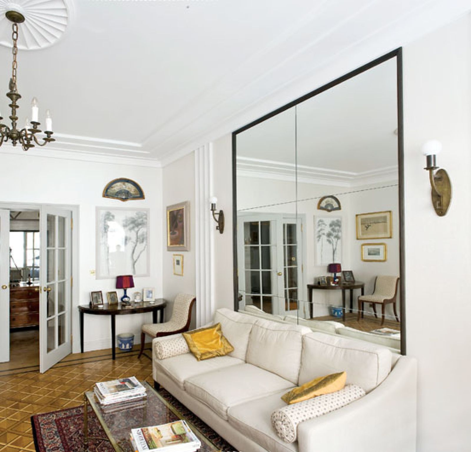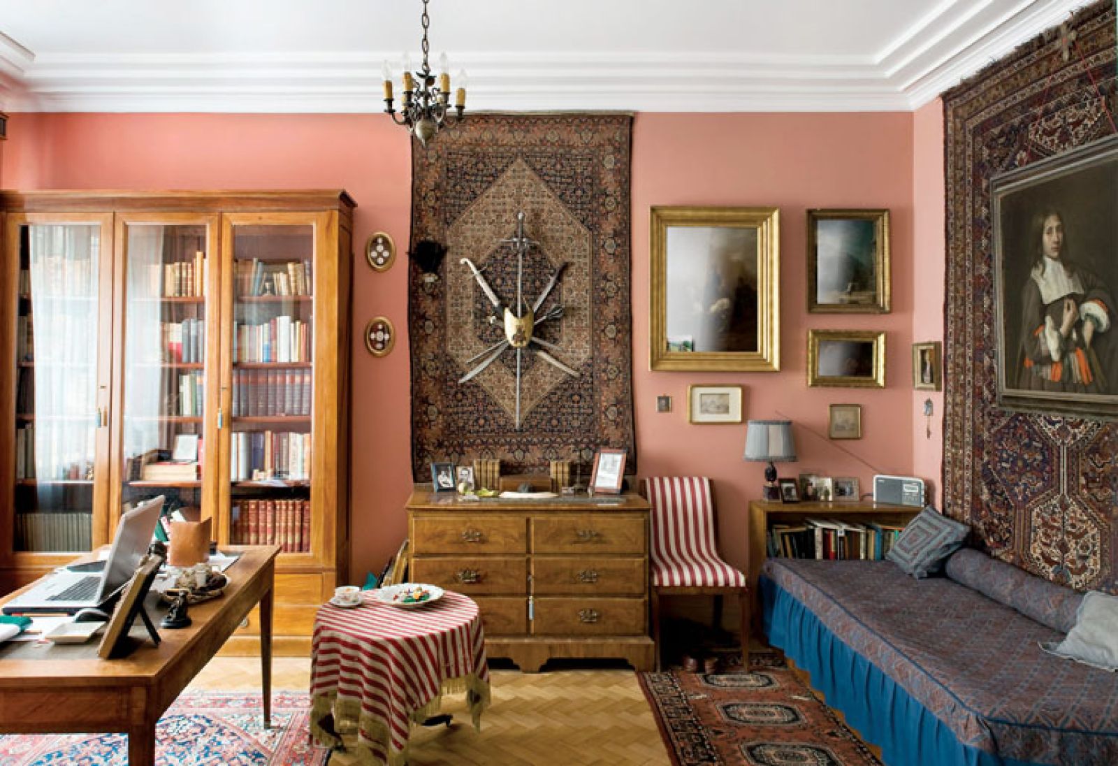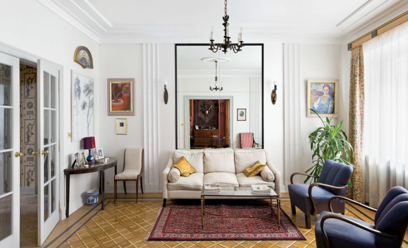 Śmieje się, że przy urządzaniu mieszkania znów poczuł się jak konserwator zabytków, bo musiał odtworzyć klimat kamienicy z lat 30. Na ścianach pojawiły się pilastry, na sufitach plafony, w drzwiach oryginalne gałki, meble z londyńskich i paryskich antykwariatów (na przykład para rzadkich konsol z różanego drewna).
