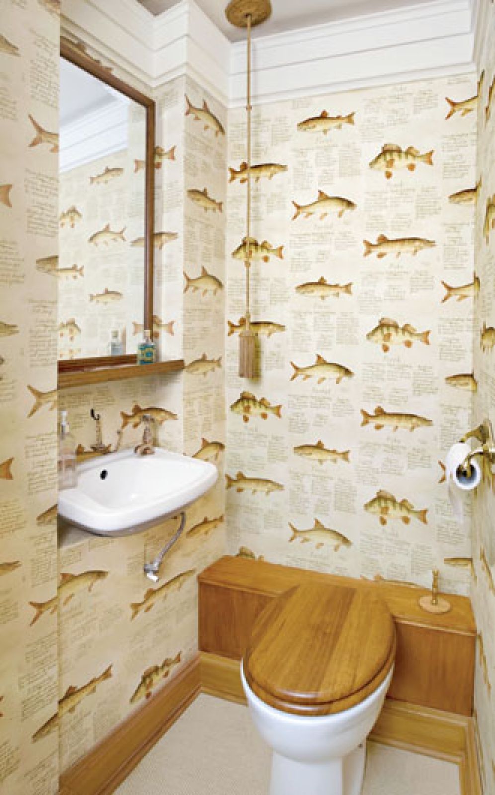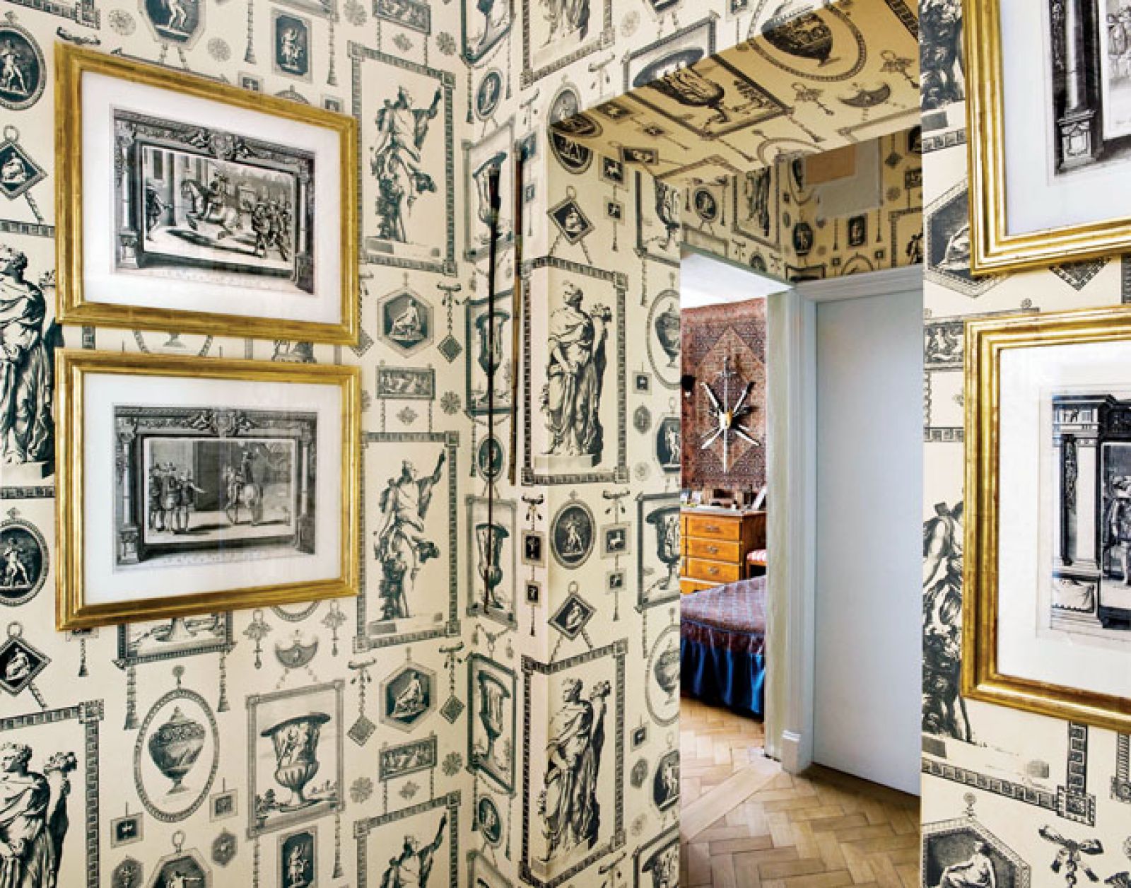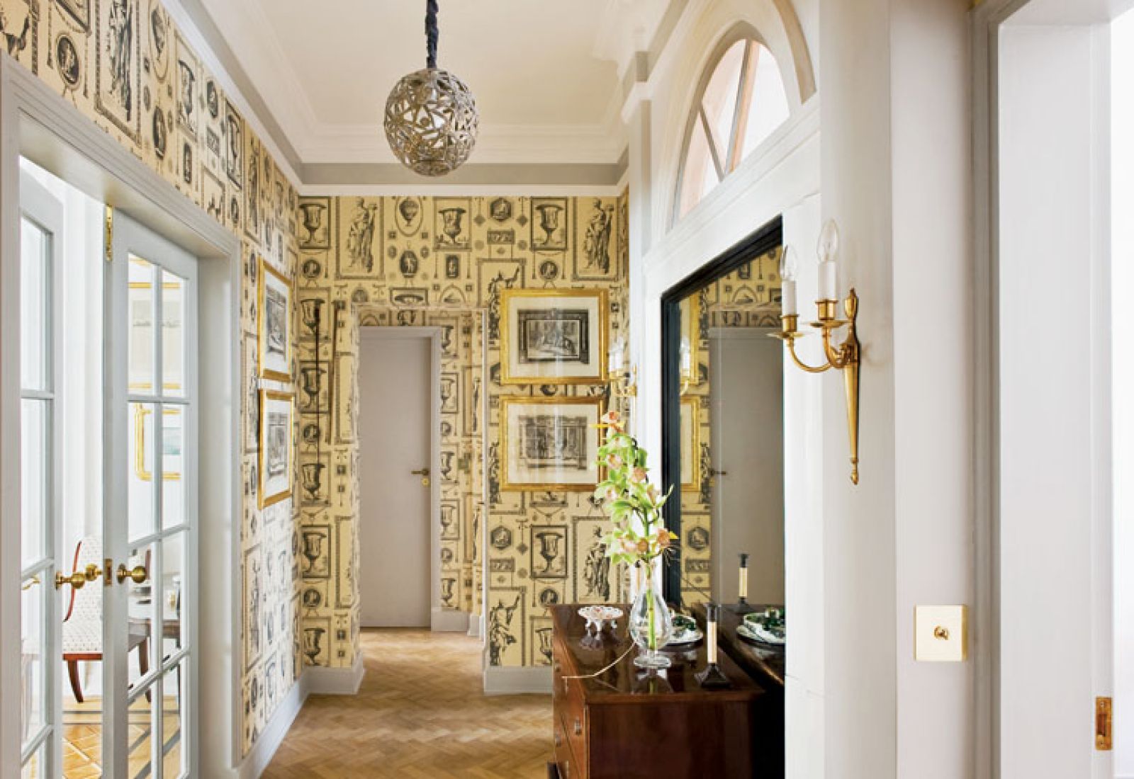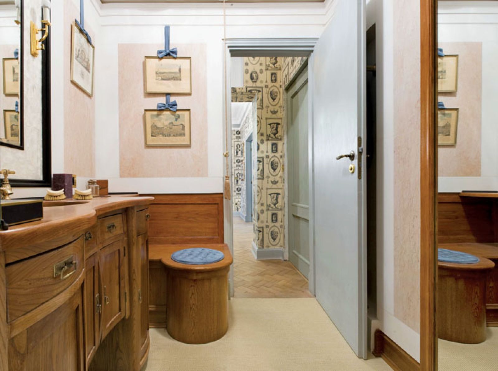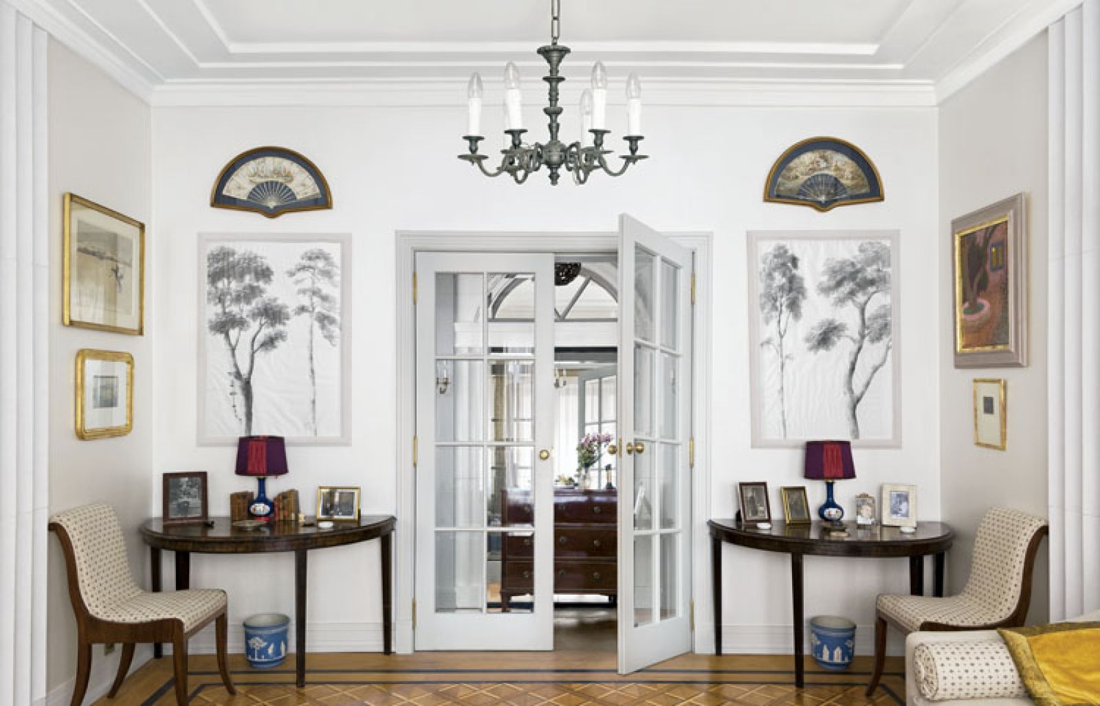 Część rzeczy zaprojektowała jego pracownia (żyrandol w salonie, szeroki karnisz nad oknem), tkaniny i tapety sprowadził z Anglii i Francji (obicia na fotele firmy Marvic, zasłony od Rubelli Textiles, tapeta w rybki to Lewis & Wood, a te z XVIII-wiecznymi grafikami – Outlaw & Outlaw). Kolory są chłodne: szarości, beże, czerń. Takie wybierali architekci lat 30. – Przytulne wnętrze można stworzyć nie tylko mocnymi barwami.